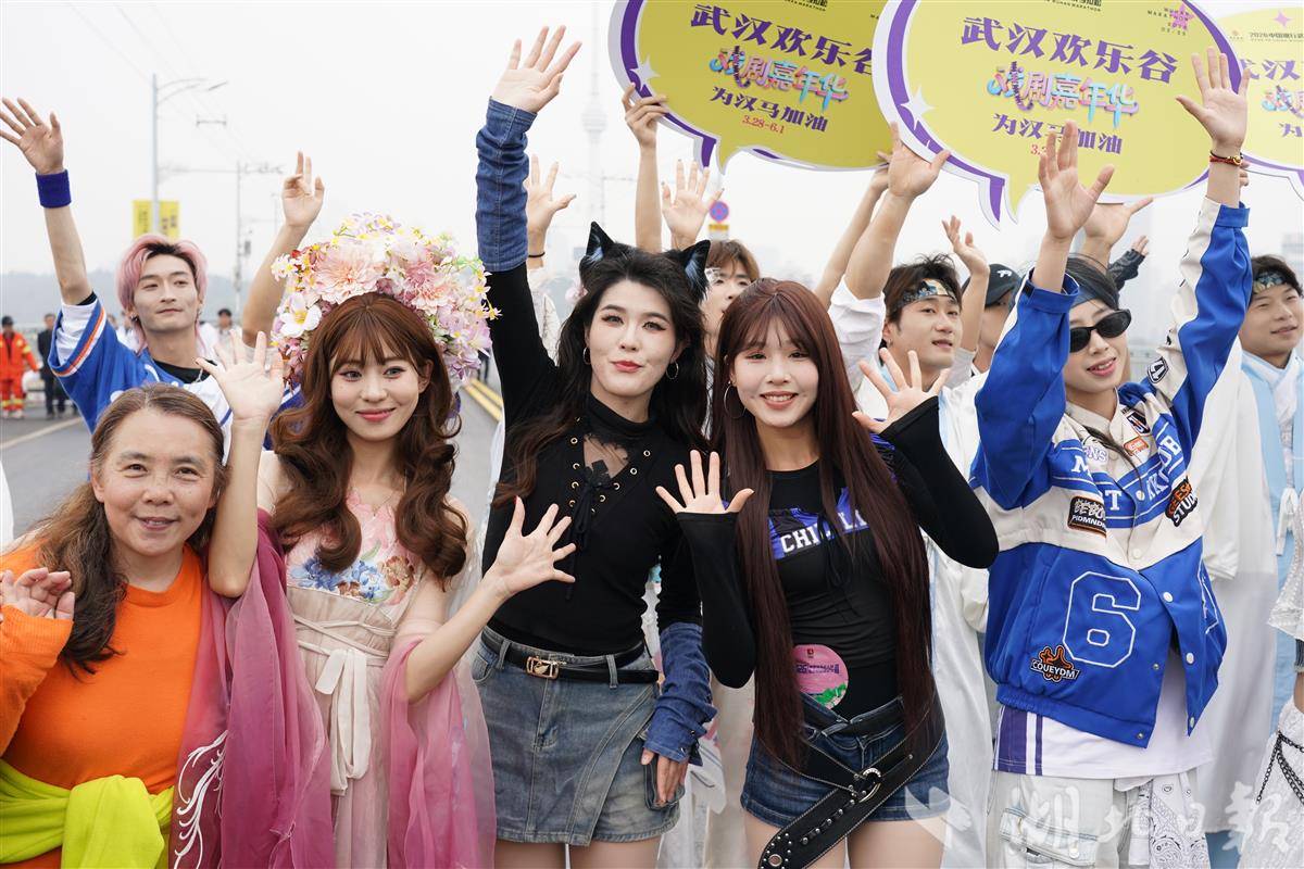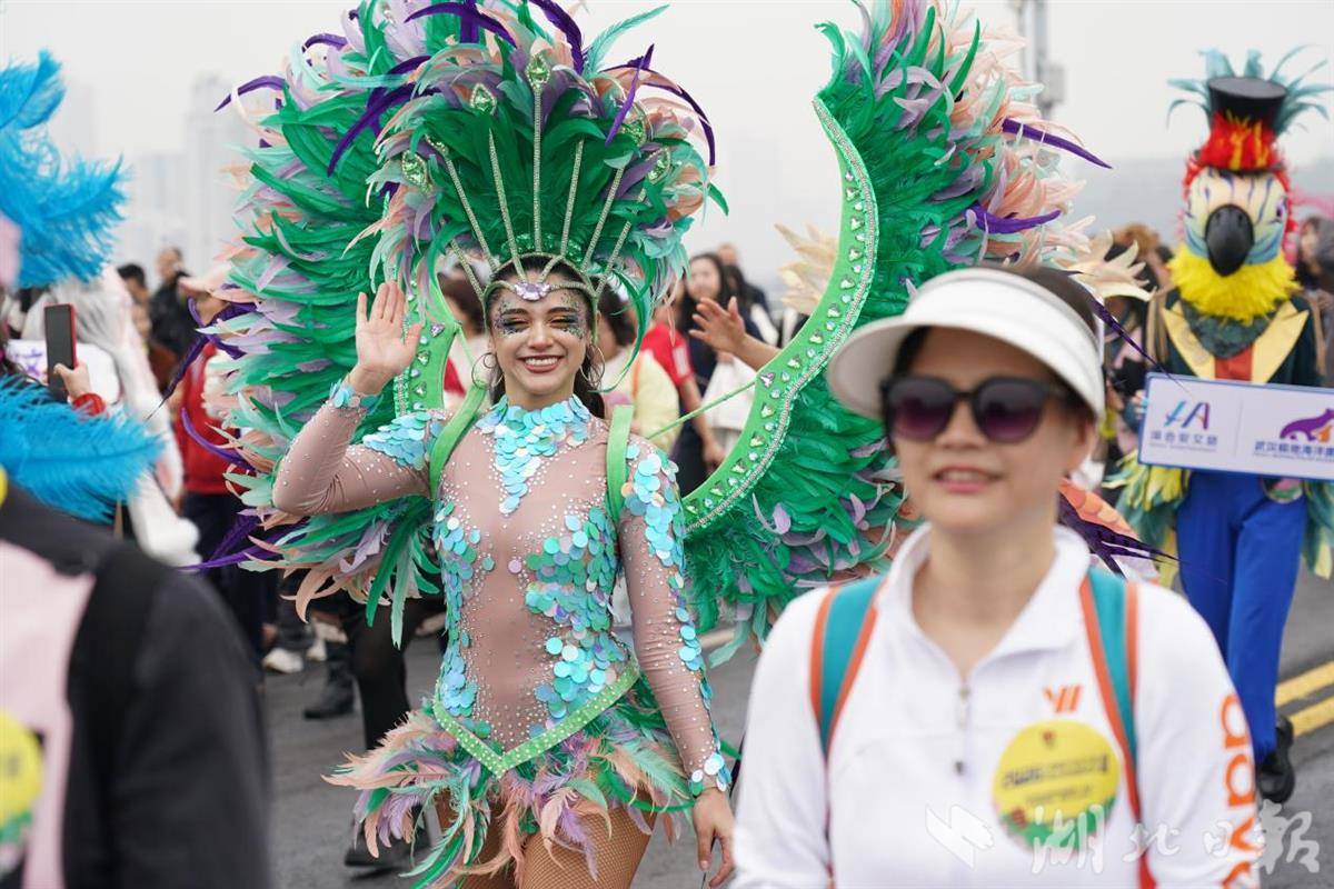 3月22日上午9时许,随着汉马大军跑过,武汉长江大桥“嘉年华”开场——百名中外演员构成巡游队伍,演绎京楚汉剧和热情歌舞,数千名市民游客用脚步丈量大桥,纷纷留影记录欢乐时刻。