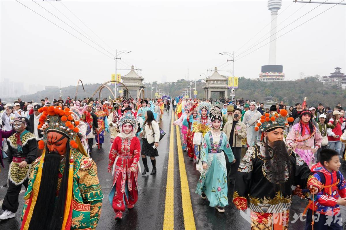 武汉戏码头经典戏曲人物巡游方阵率先登场,来自武汉京剧院、汉剧院、楚剧院的50名演员身着精美戏服、佩戴专业行头,以经典戏曲人物形象亮相长江大桥,尽显“戏水长流,戏聚江城”的深厚底蕴。