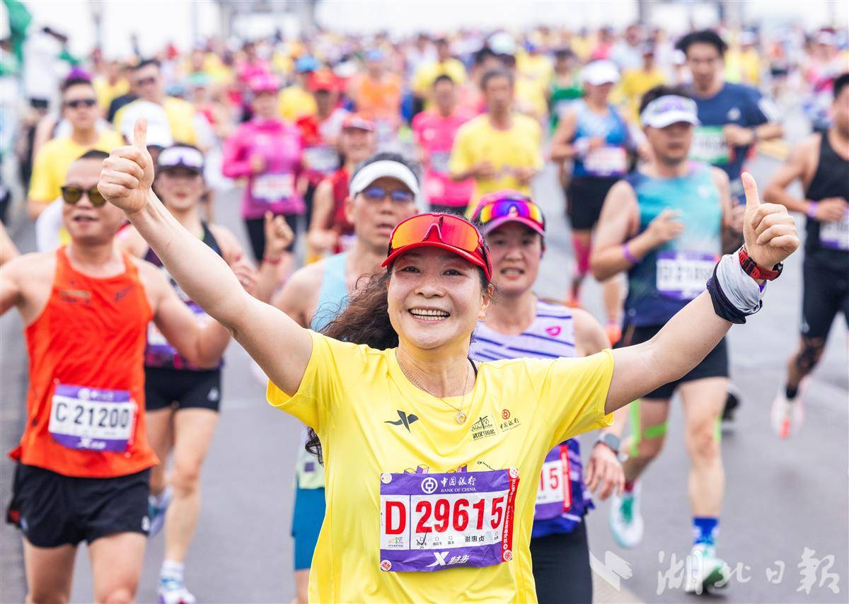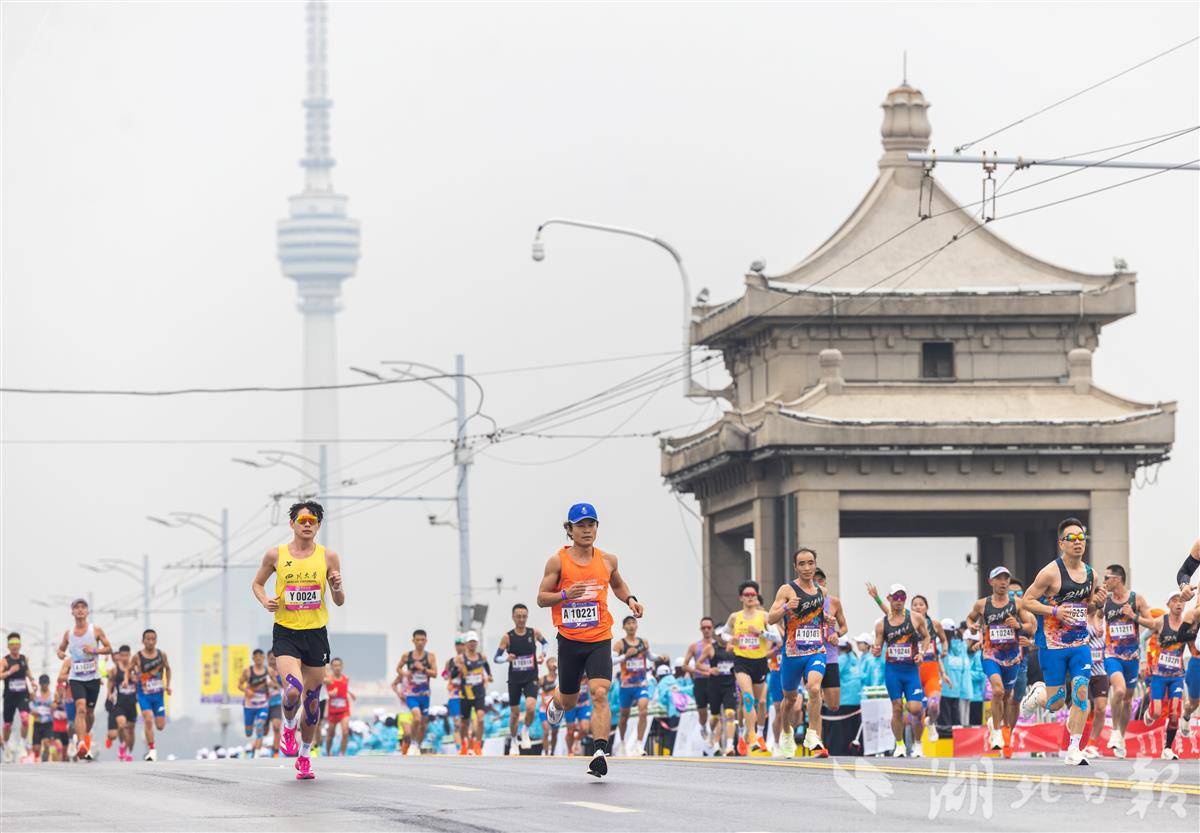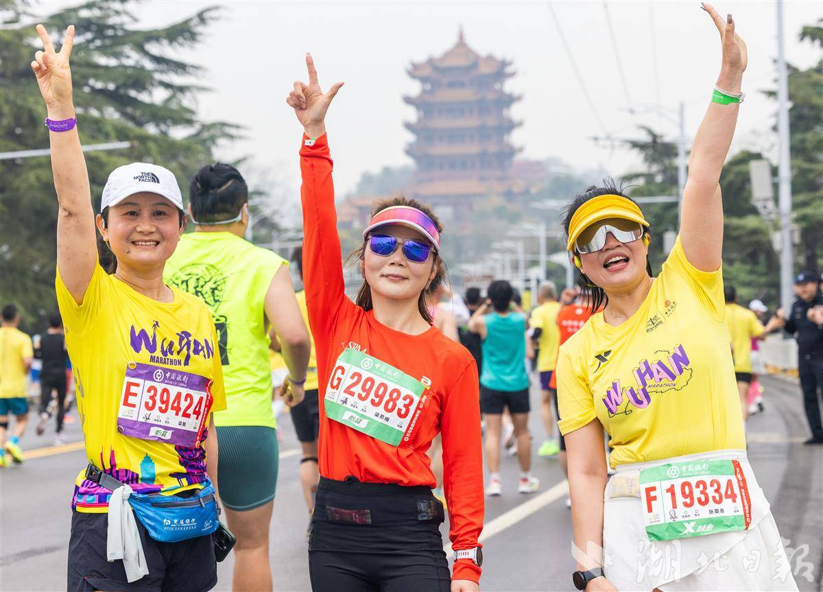 3月22日,2026武汉马拉松鸣枪开跑。图为参赛选手与武汉地标黄鹤楼合影留念。