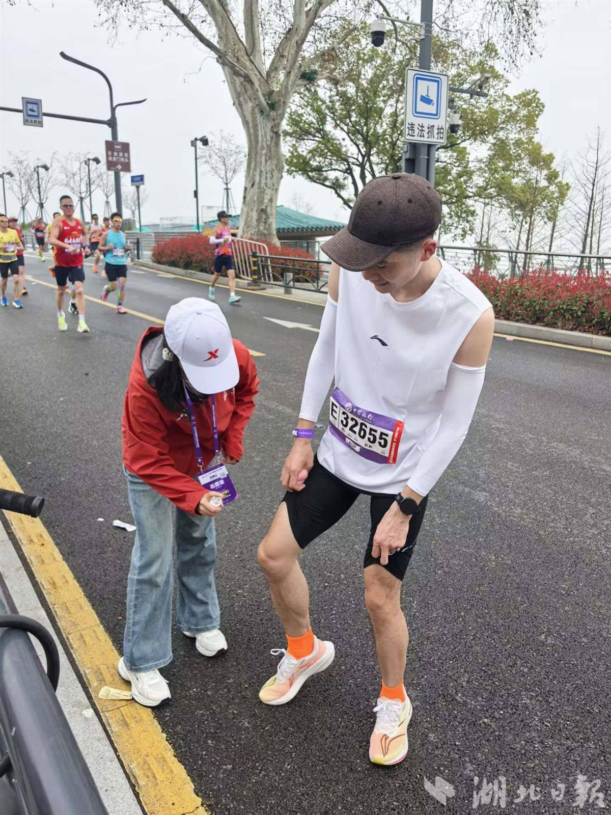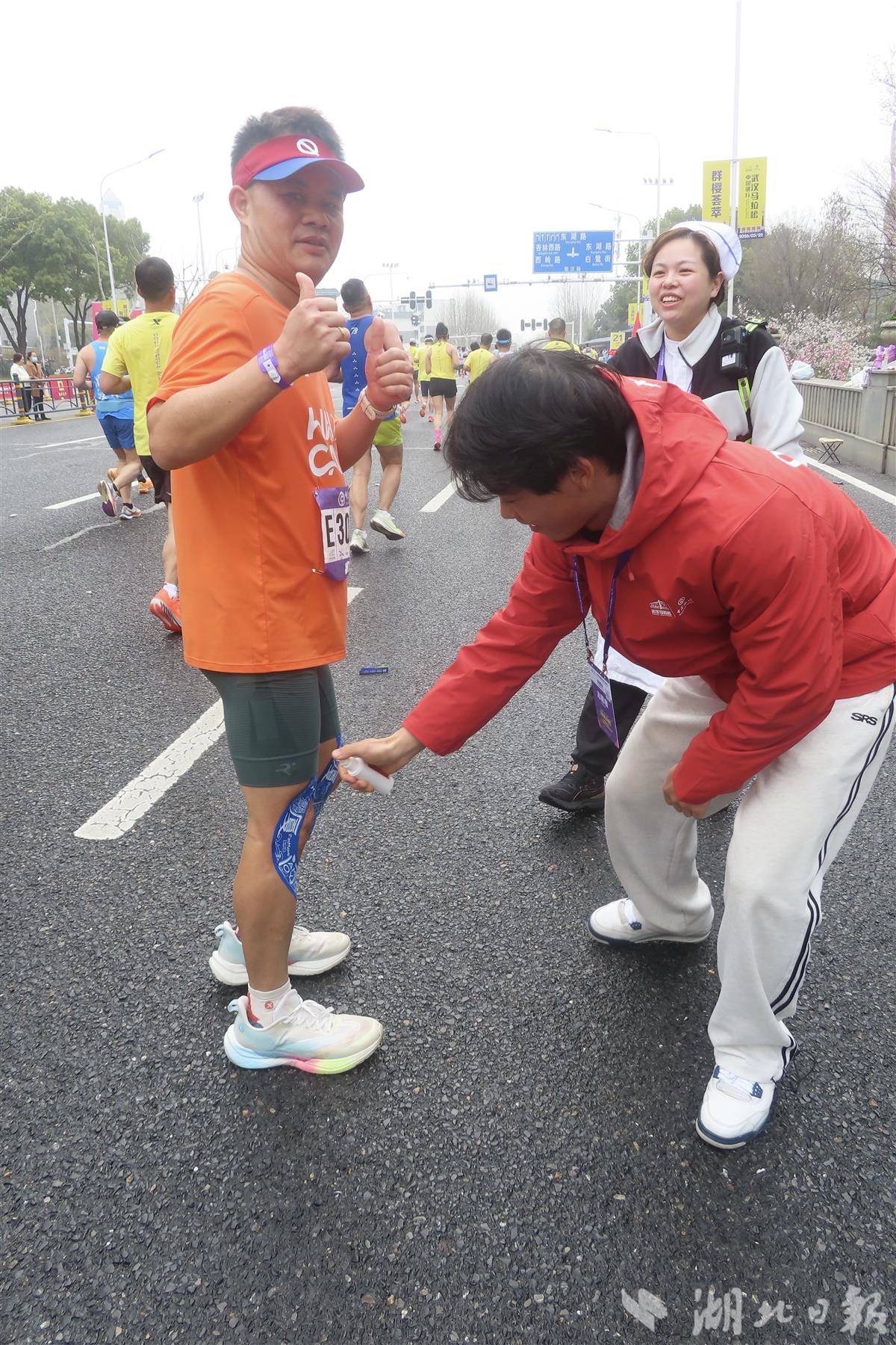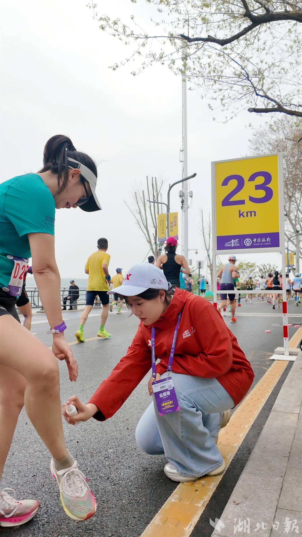 湖北中医药大学志愿者正在为汉马跑者提供志愿服务。(受访单位供图)