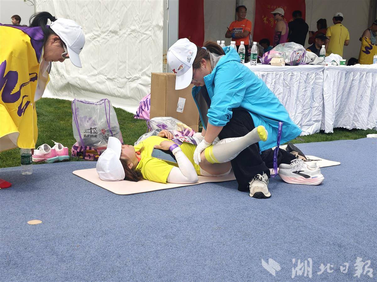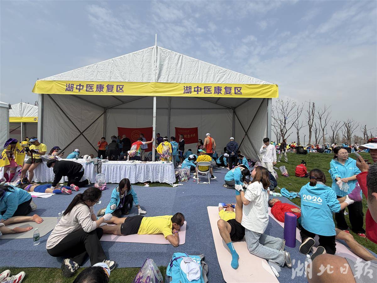 今年,湖北中医药大学有550名学子参加志愿服务,仅在半程终点处和全程终点处就各配有40余名运动康复和针灸推拿专业志愿者,为完赛的跑者舒缓疲劳、处理伤痛。