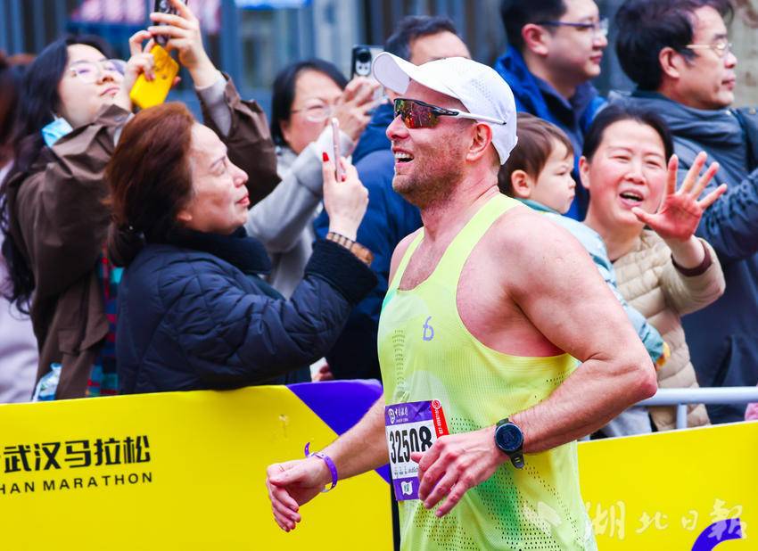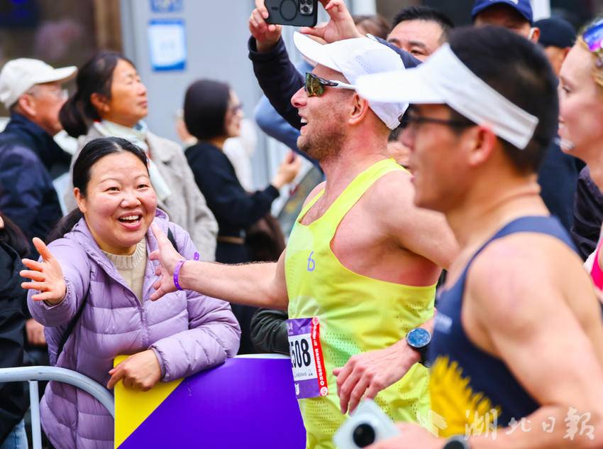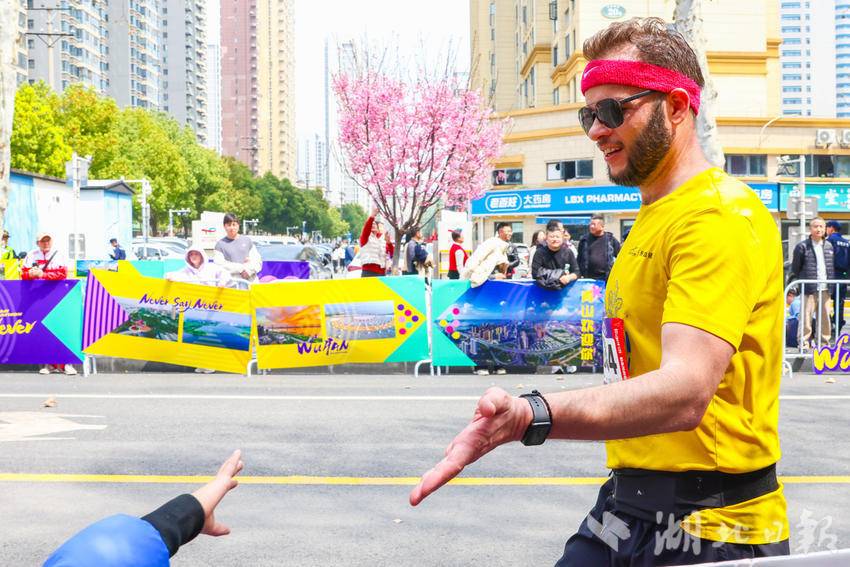 3月22日,外籍选手和赛道旁的观众互动。(湖北日报全媒记者 柯皓 摄)