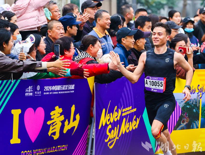 3月22日,参赛选手和赛道旁的观众互动。(湖北日报全媒记者 柯皓 摄)