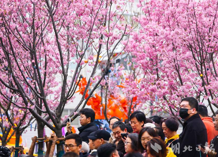 3月22日,市民在樱花树下为参赛选手加油。(湖北日报全媒记者 柯皓 摄)