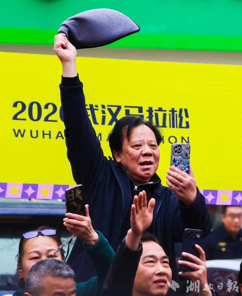 3月22日,一位市民挥舞着抹布为参赛选手加油。(湖北日报全媒记者 柯皓 摄)