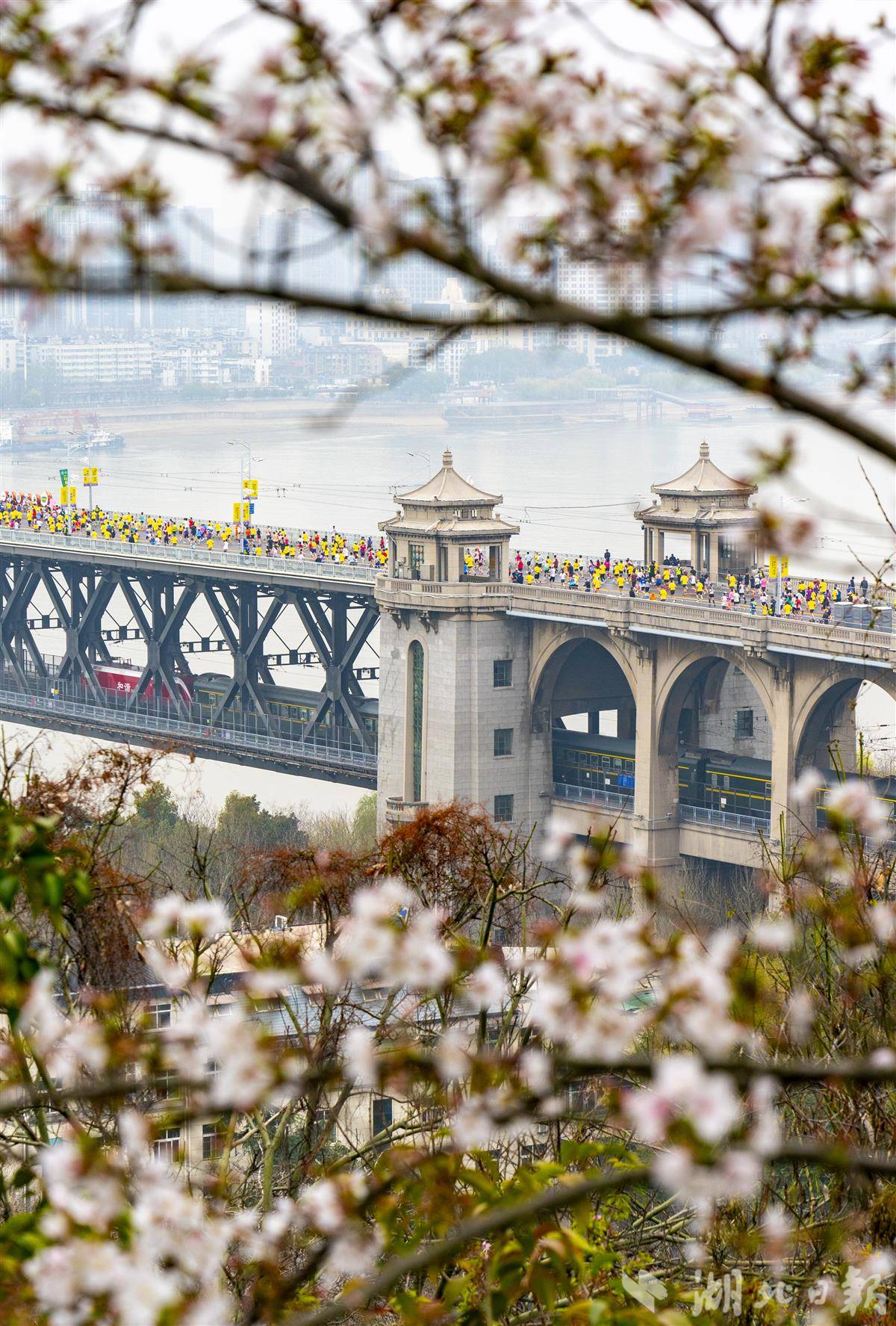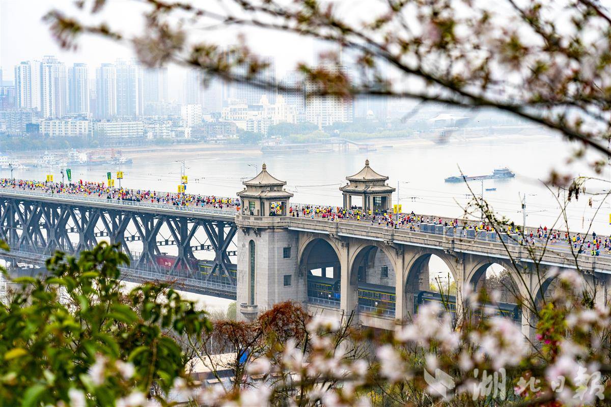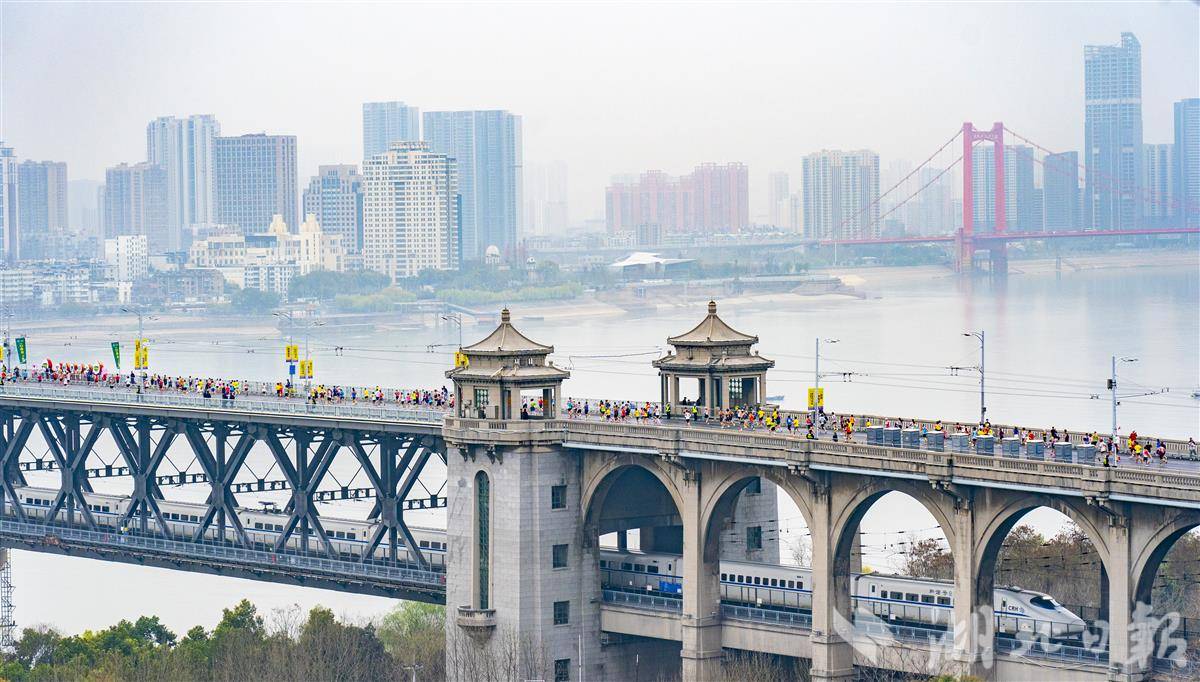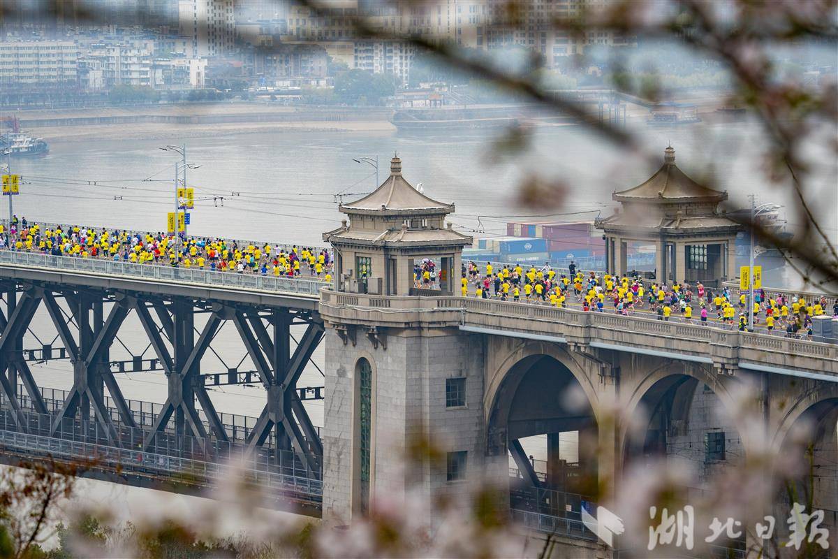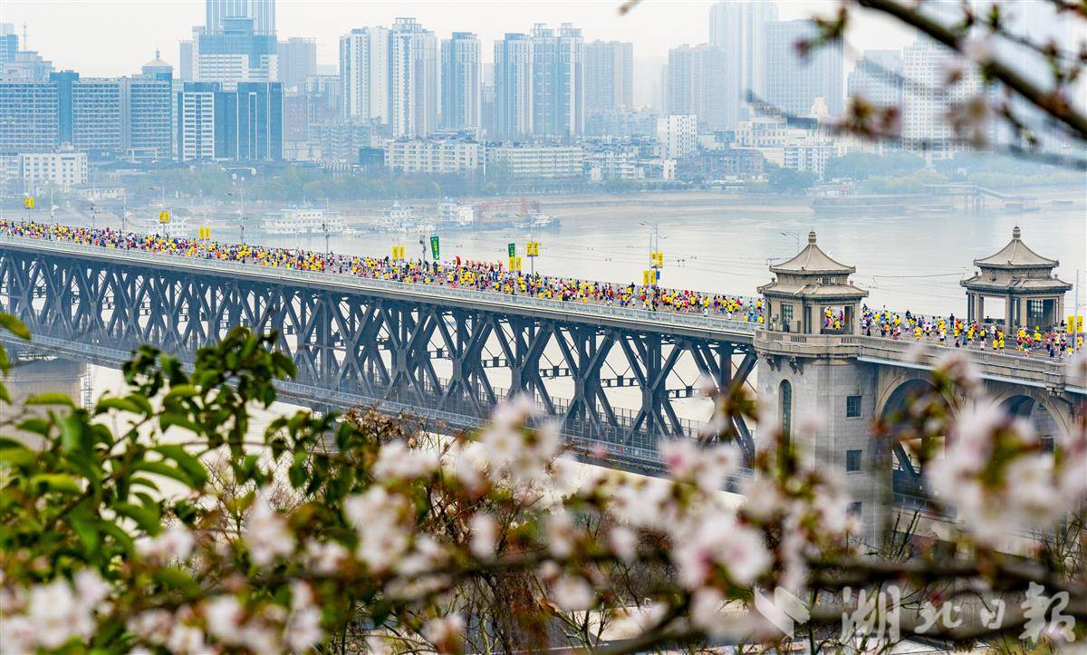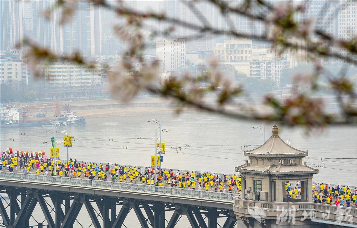 3月22日,2026武汉马拉松鸣枪开跑,来自世界各地的3万名跑者在奔跑中共赴武汉春日樱花之约。图为参赛选手奔跑在武汉长江大桥上。(湖北日报全媒记者 魏铼 摄)