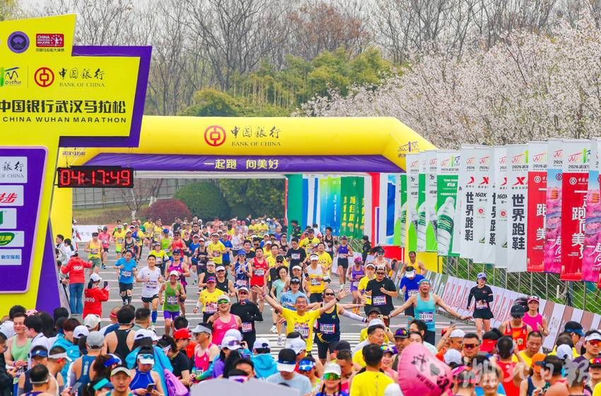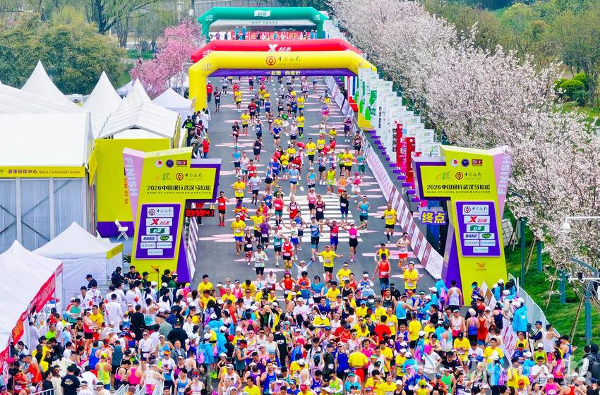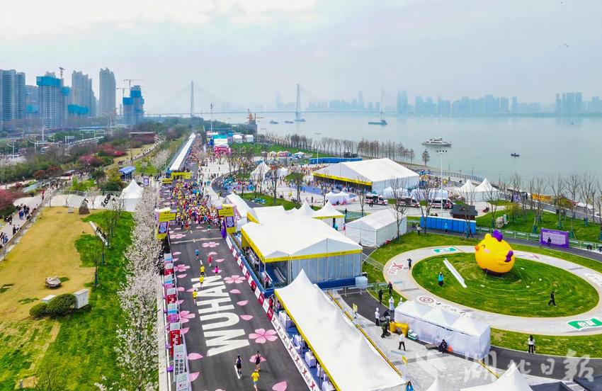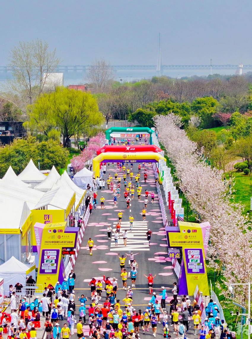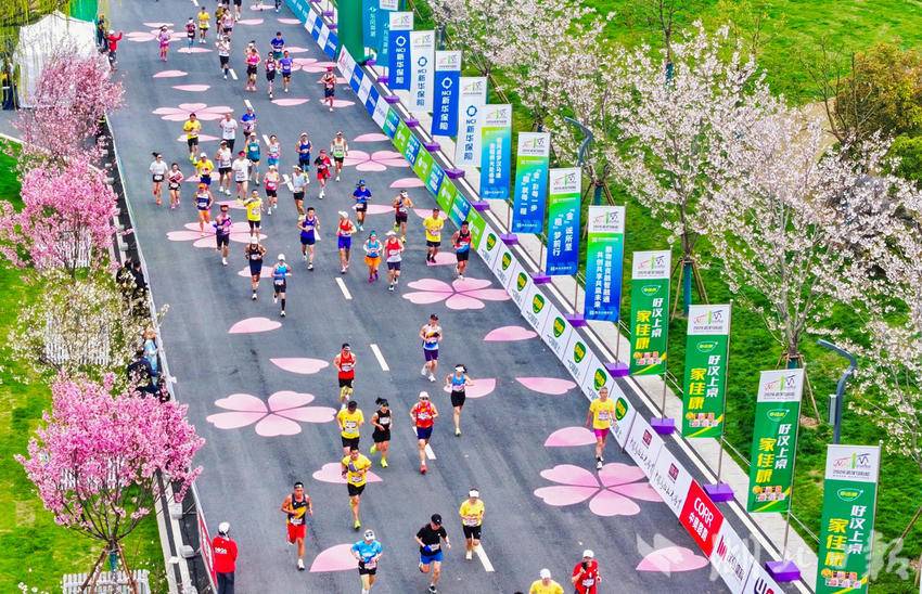 3月22日,参赛选手冲向终点。本届汉马终点区域被打造成“樱花大道”‌,营造出浓厚的浪漫氛围,成为赛道独具特色的景观。(湖北日报全媒记者 柯皓 通讯员 袁征 摄)
