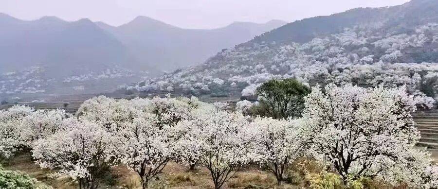 站在山顶俯瞰,千亩李花如雪浪翻涌