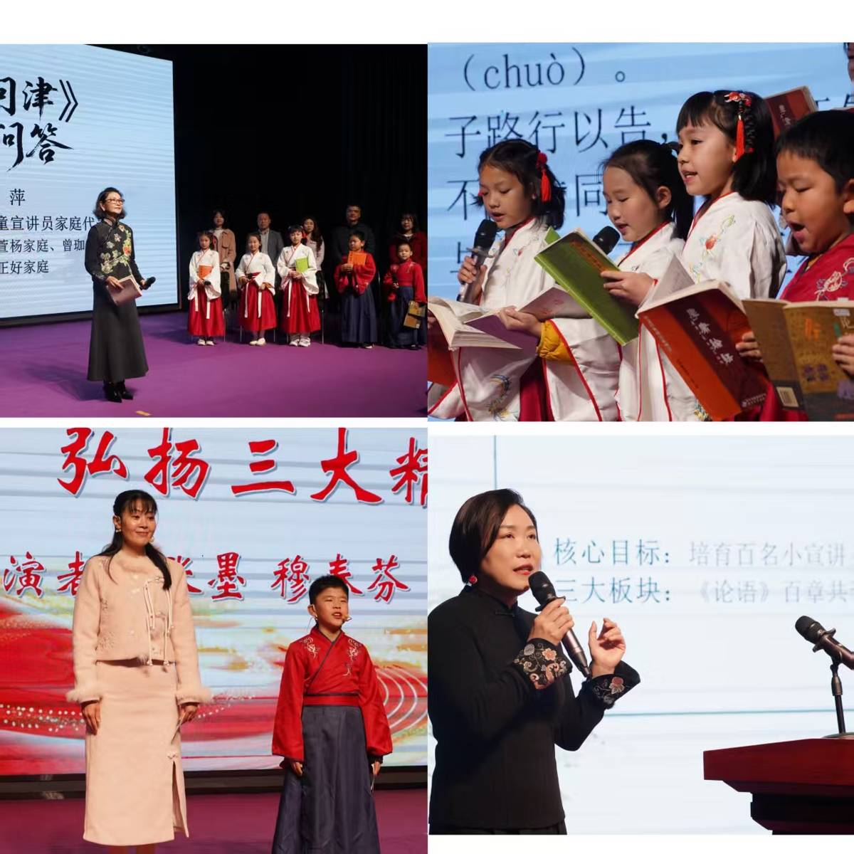 启动仪式现场,朗诵艺术家鄢萍带领6组亲子班学员家庭,以情景课堂的创新形式演绎《子路问津》学思问答,通过沉浸式的互动演绎,让经典文本走出书页,生动展现出经典阅读的趣味与思想深度。新学员家庭代表张墨与母亲穆春芬登台分享,以孩子的童真视角讲述对“三大精神”的理解与感悟,质朴的表达、真挚的情感让现场观众深受感染。