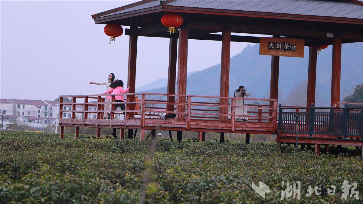 湖北日报讯(通讯员付向阳)3月22日,周末的英山县金家铺镇志顺茶园热闹非凡,除了劳作的茶农,有在茶园中翩翩起舞的游客,还有采茶姑娘在直播。春日暖阳下,新茶吐蕊、花香四溢,构成一幅茶旅融合的春日美景。