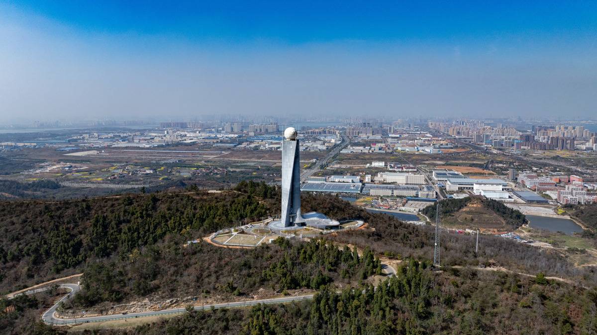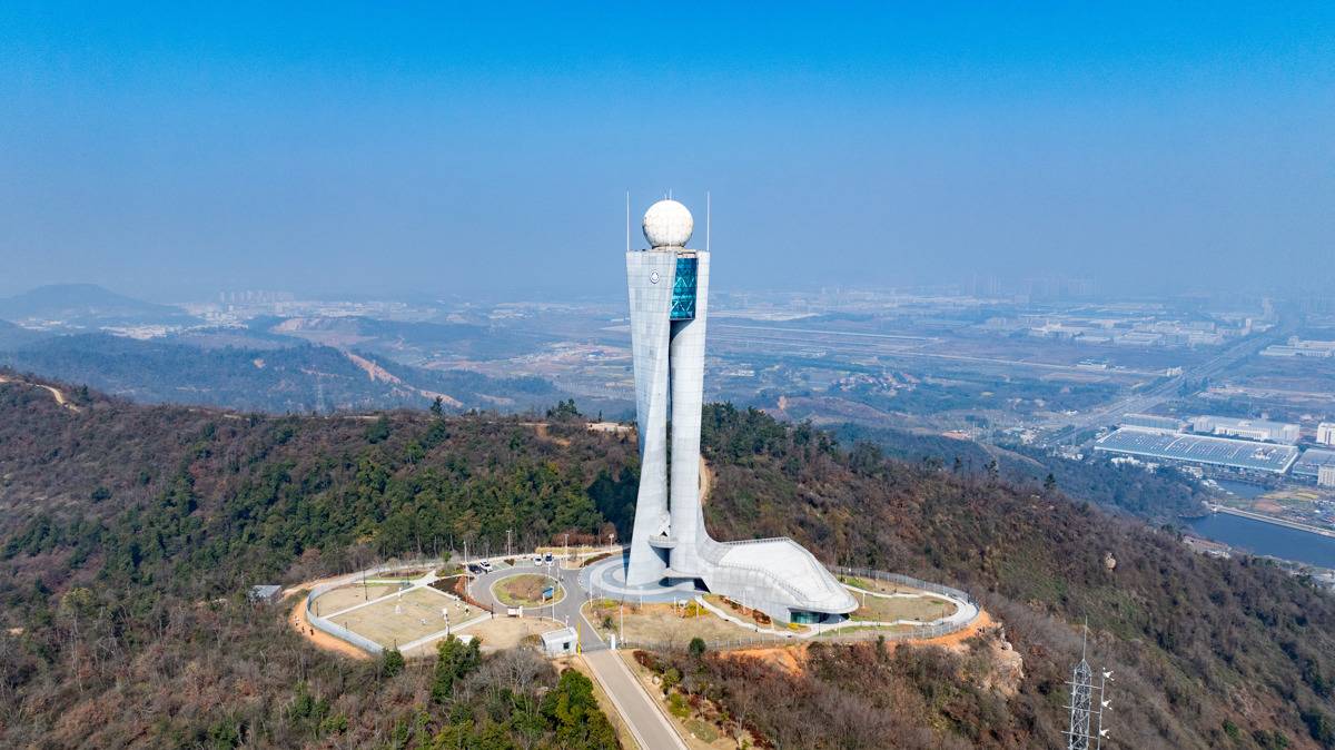 2026年3月22日,世界气象日前夕,航拍位于武汉市江夏区八分山的武汉(新一代)天气雷达塔。(湖北日报全媒记者 何宇欣 摄)
