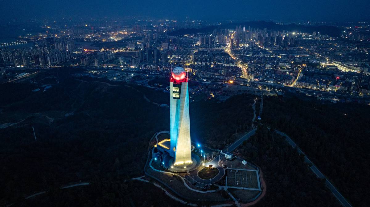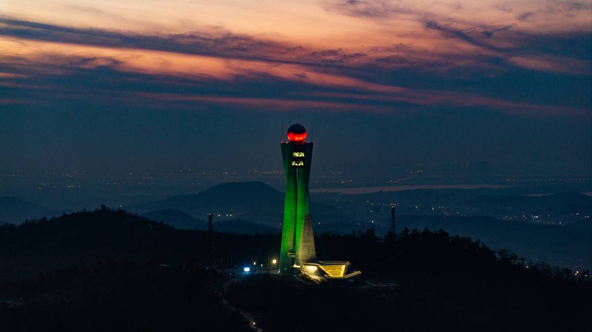 2026年3月22日晚,世界气象日前夕,航拍位于武汉市江夏区八分山的武汉(新一代)天气雷达塔。每到夜晚,塔顶的灯光会根据天气预报显示不同的颜色,红色代表晴天,黄色代表雨天,绿色则意味着明天是阴天或者多云。(湖北日报全媒记者 何宇欣 摄)