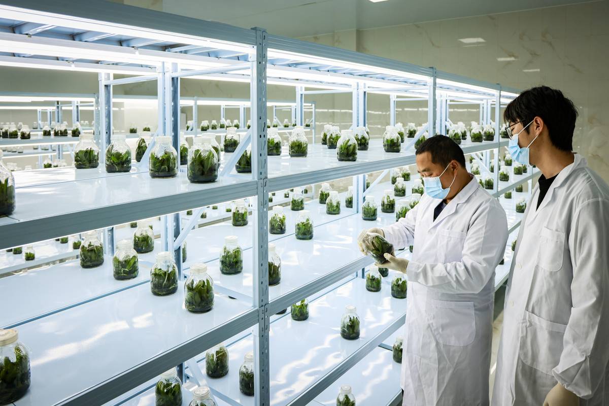 育苗中心里,技术人员正在检查组培液情况。(湖北日报全媒记者 成熔兴 通讯员 陈钦 摄)