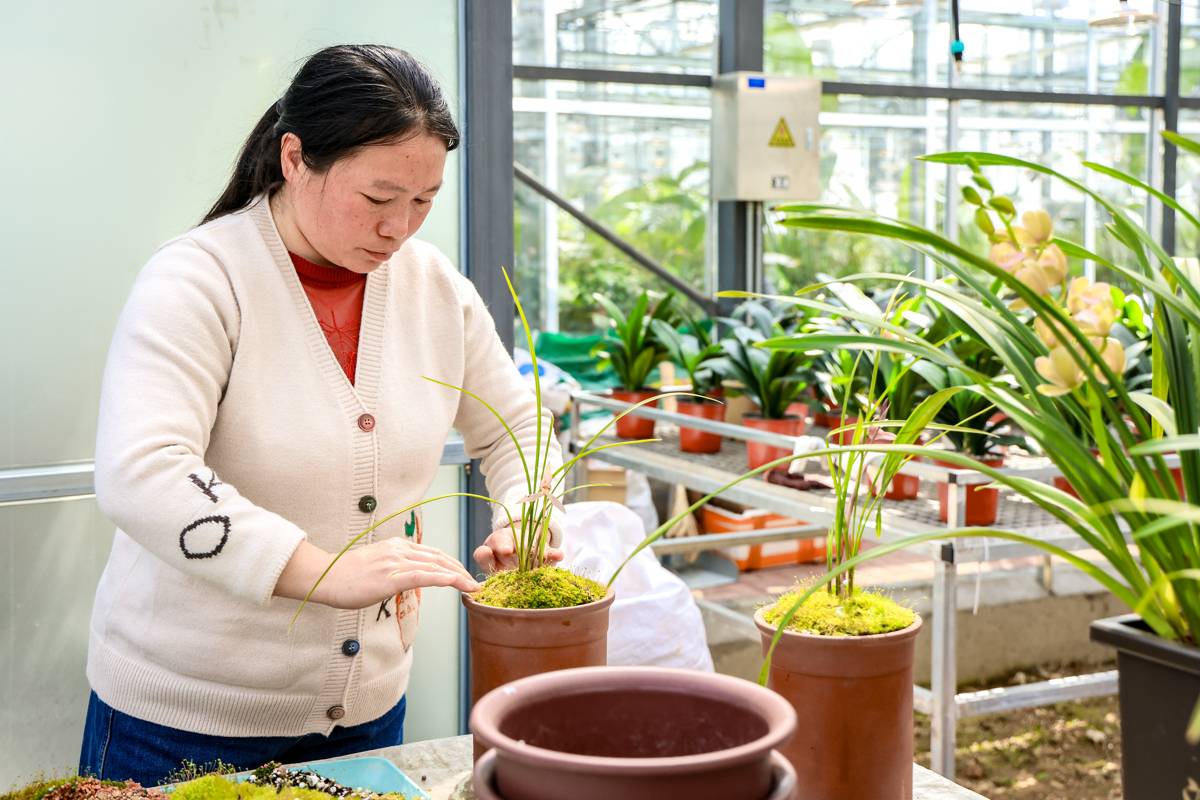 工人正在整理待售的兰花。(湖北日报全媒记者 成熔兴 通讯员 陈钦 摄)
