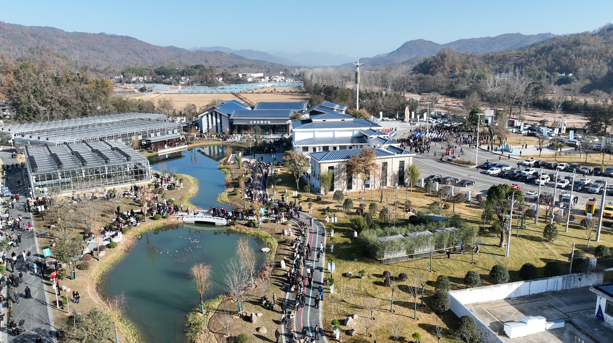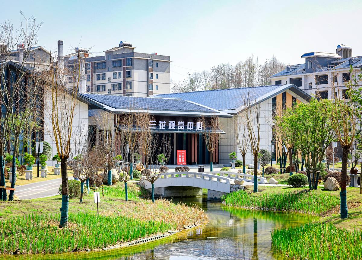画廊起笔处,一片白墙黛瓦的建筑群就嵌在山脚。走近,小桥流水,芳香四溢,便是落成不久的大别山兰花产业园。