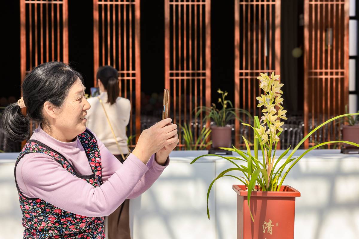 精品兰花观赏中心里,游客正给兰花拍照。(湖北日报全媒记者 成熔兴 通讯员 陈钦 摄)