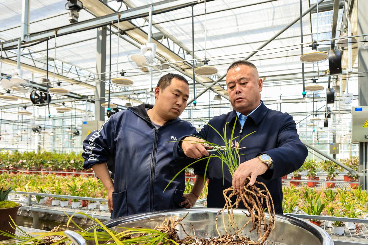 大别山兰花产业园的智能化温室大棚里,居建新正在指导工人分盆定栽。(湖北日报全媒记者 成熔兴 通讯员 陈钦 摄)