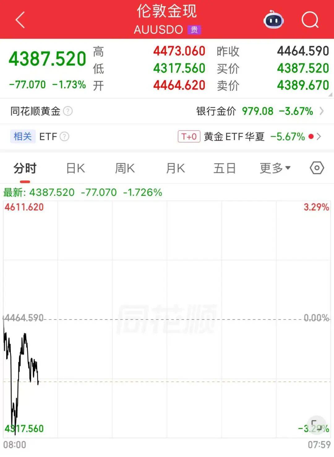 3月23日,现货黄金一度向下跌破4350美元,现报4387.520美元/盎司,日内跌3.54%。