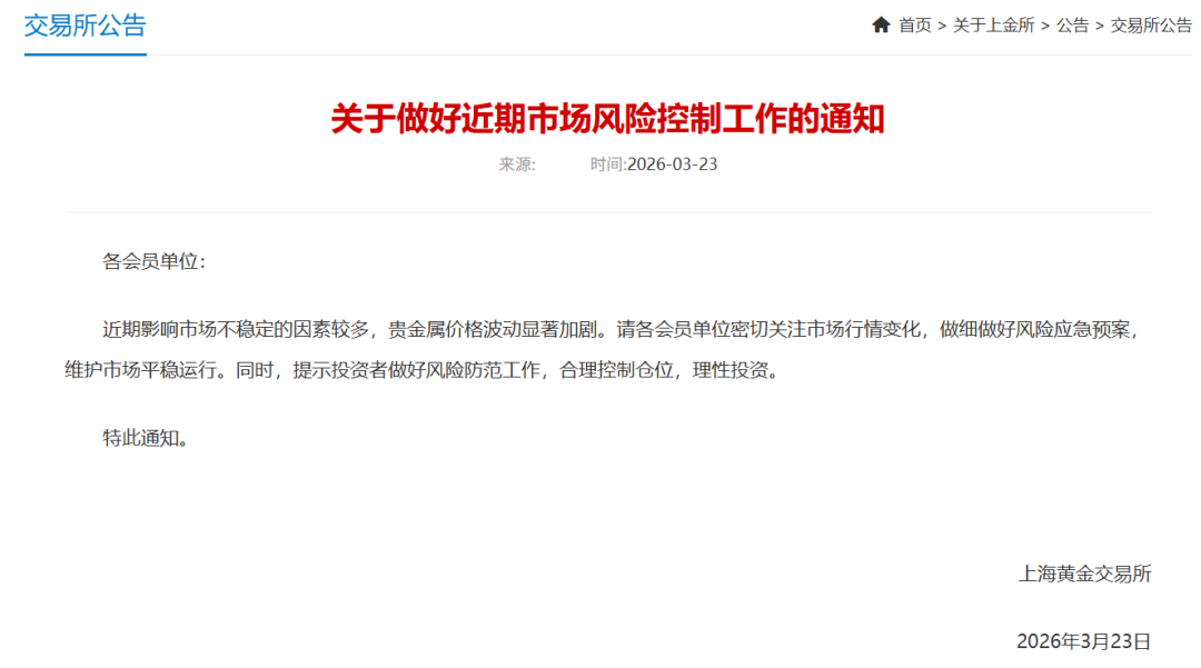 3月23日,上金所发布通知,近期影响市场不稳定的因素较多,贵金属价格波动显著加剧。请各会员单位密切关注市场行情变化,做细做好风险应急预案,维护市场平稳运行。同时,提示投资者做好风险防范工作,合理控制仓位,理性投资。