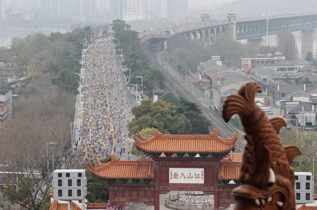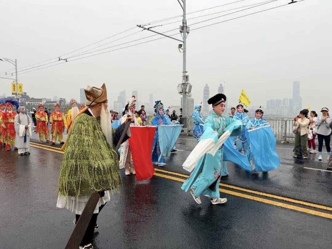 3月22日9时许,当汉马跑者全部路过武汉长江大桥,数千名市民游客和表演方阵参加2026“跟着汉马走大桥 ‘花点’时间游武汉”活动。