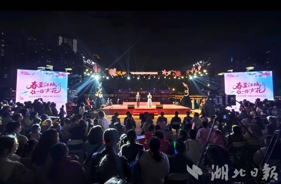 湖北日报讯(记者农新瑜、通讯员韦绪华)3月21日晚,武汉汉口西北湖广场上,人头攒动,夜樱璀璨,歌声飞扬。武汉市文联品牌文艺活动“武汉音乐地图”走进汉口西北湖专场音乐会在此精彩上演,武汉知名音乐人及演出团队轮番登台,唱响武汉之歌,引来千余市民游客驻足观看。