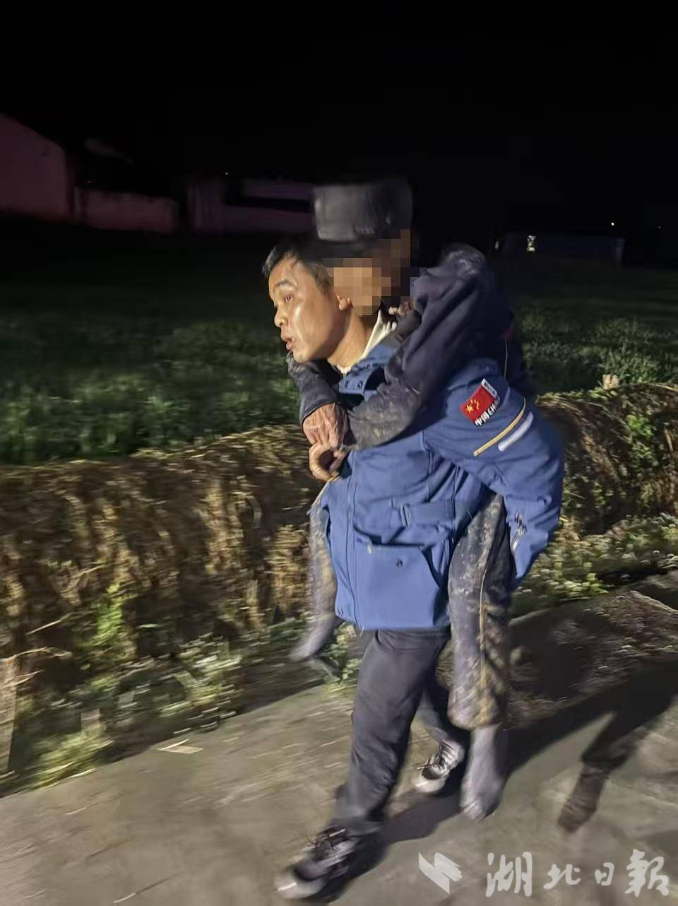 队员立即将老人抱起背在身上,脱下自身大衣紧紧裹住老人保暖,老人仍不停喊冷,队员迅速联系邻居取来干净衣物,用热水为老人擦拭身体、更换干爽衣裤。