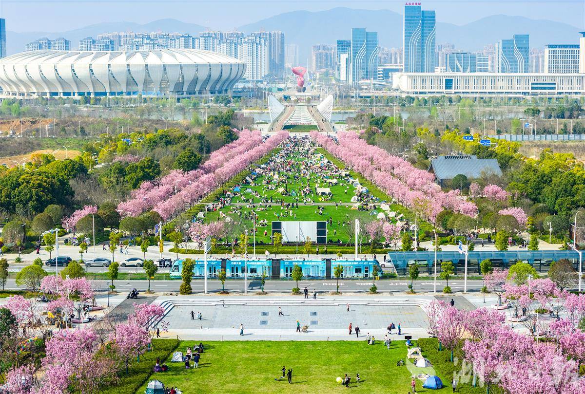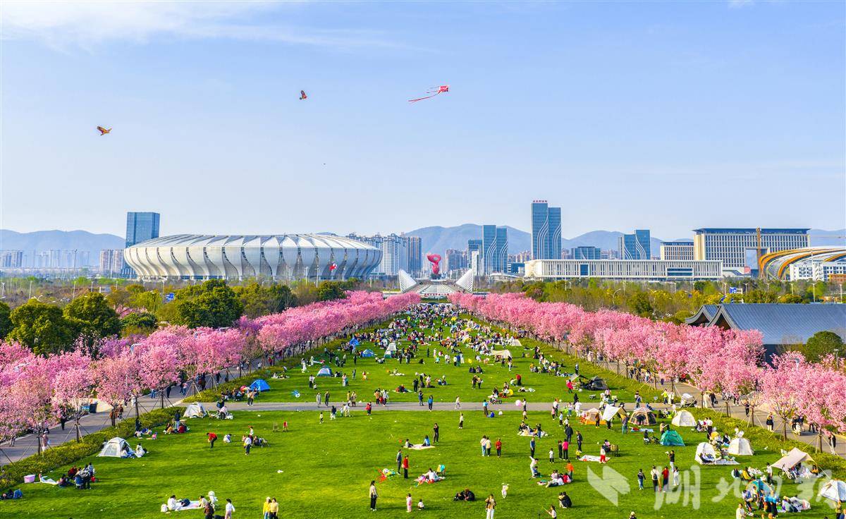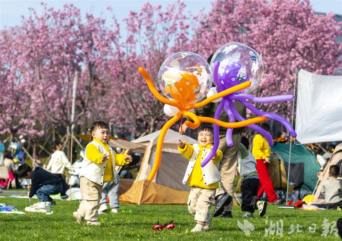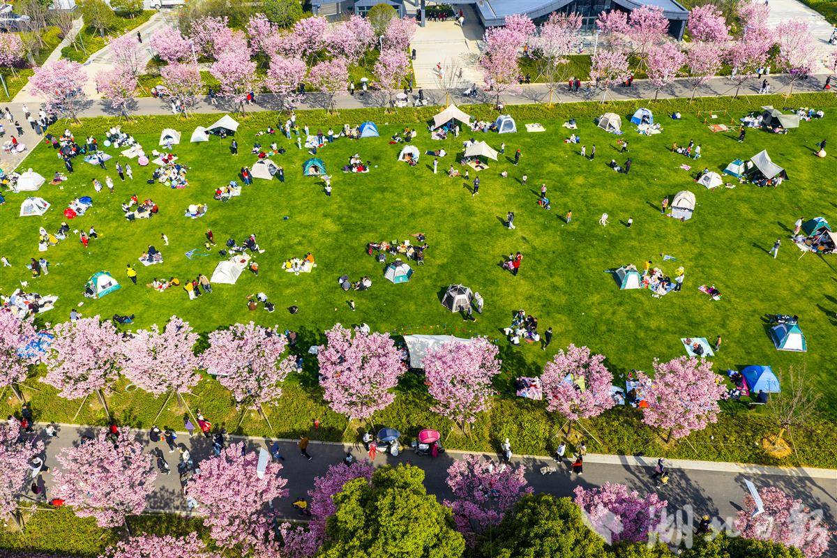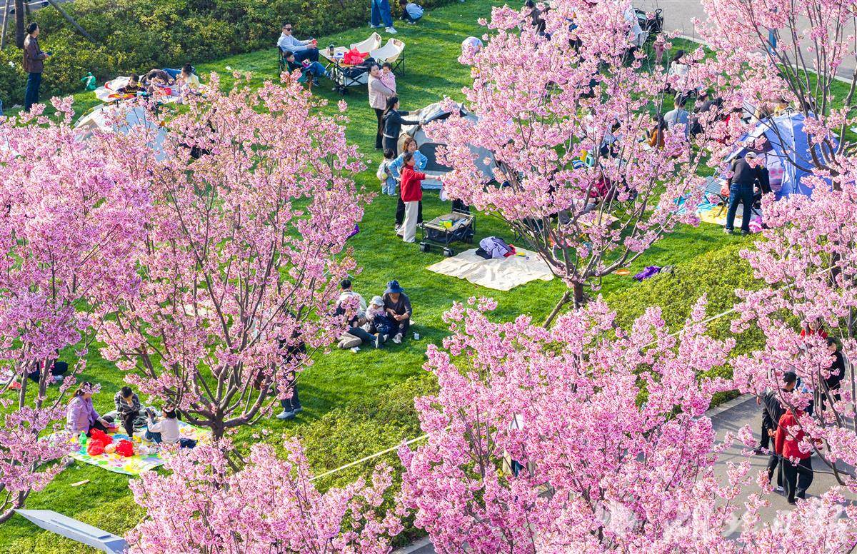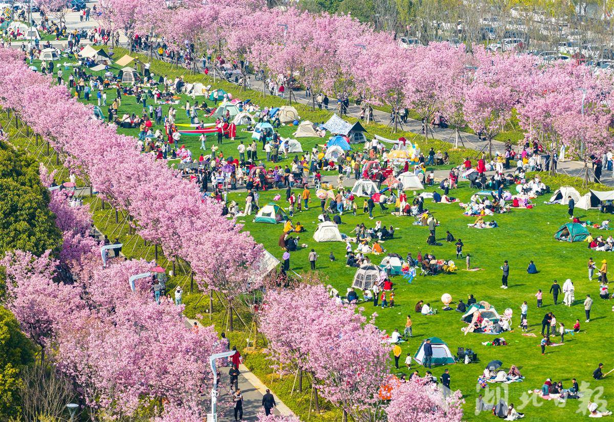 3月22日,黄石经开区黄石奥体公园花客厅樱花大道樱花盛放,市民游客在此露营休闲。