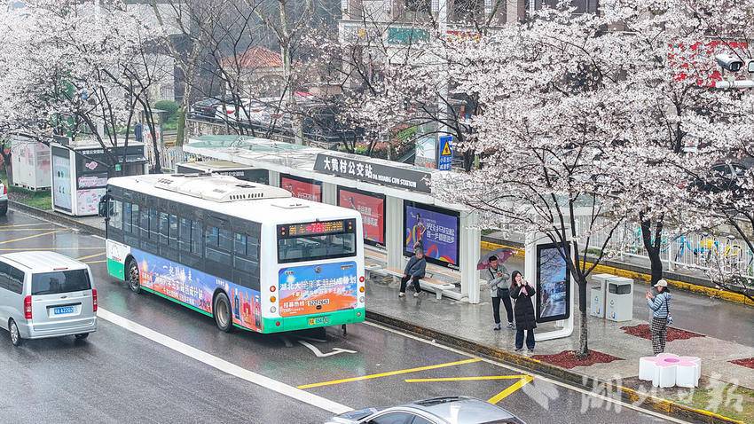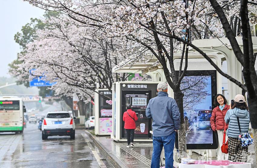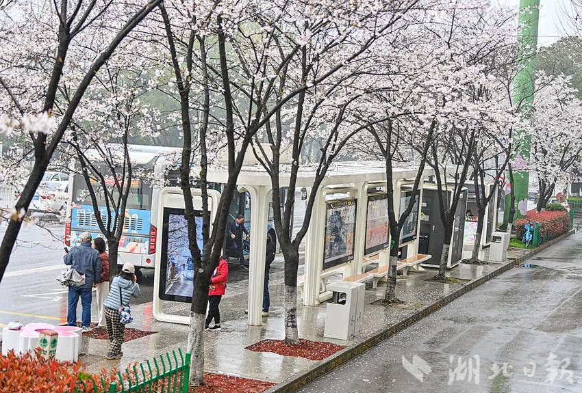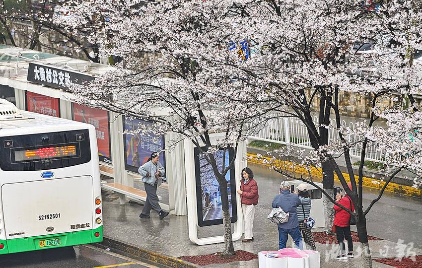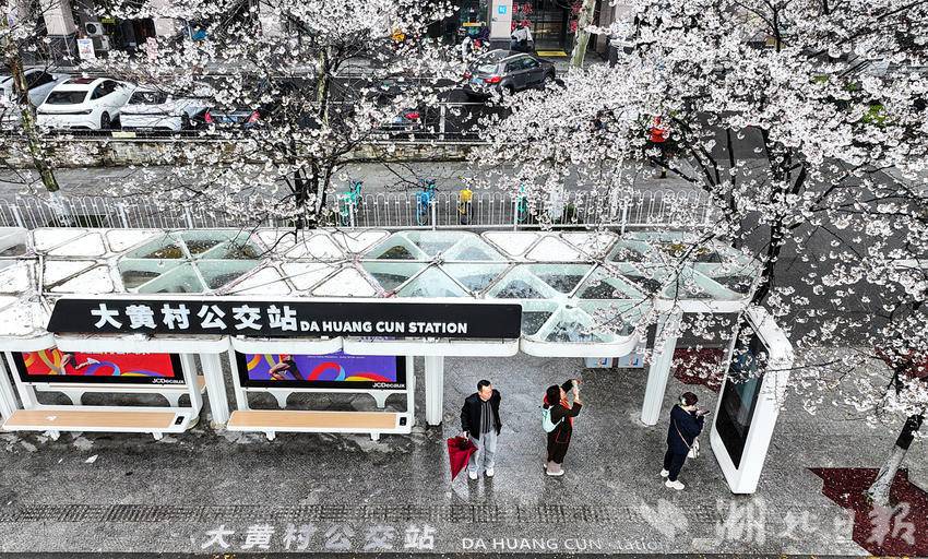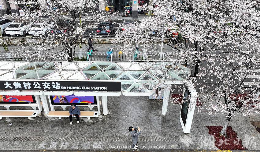 3月23日,武汉光谷珞喻东路大黄村公交站的樱花盛开了,许多游人冒雨前来打卡。该站被数十棵樱花树环绕,樱花盛开时,整个站台仿佛置身于粉色的花海之中,网友称为武汉“最美樱花公交站”。乘客在候车时就能欣赏到如云似霞的樱花美景,成为了一道独特的风景。(湖北日报全媒记者朱熙勇摄)
