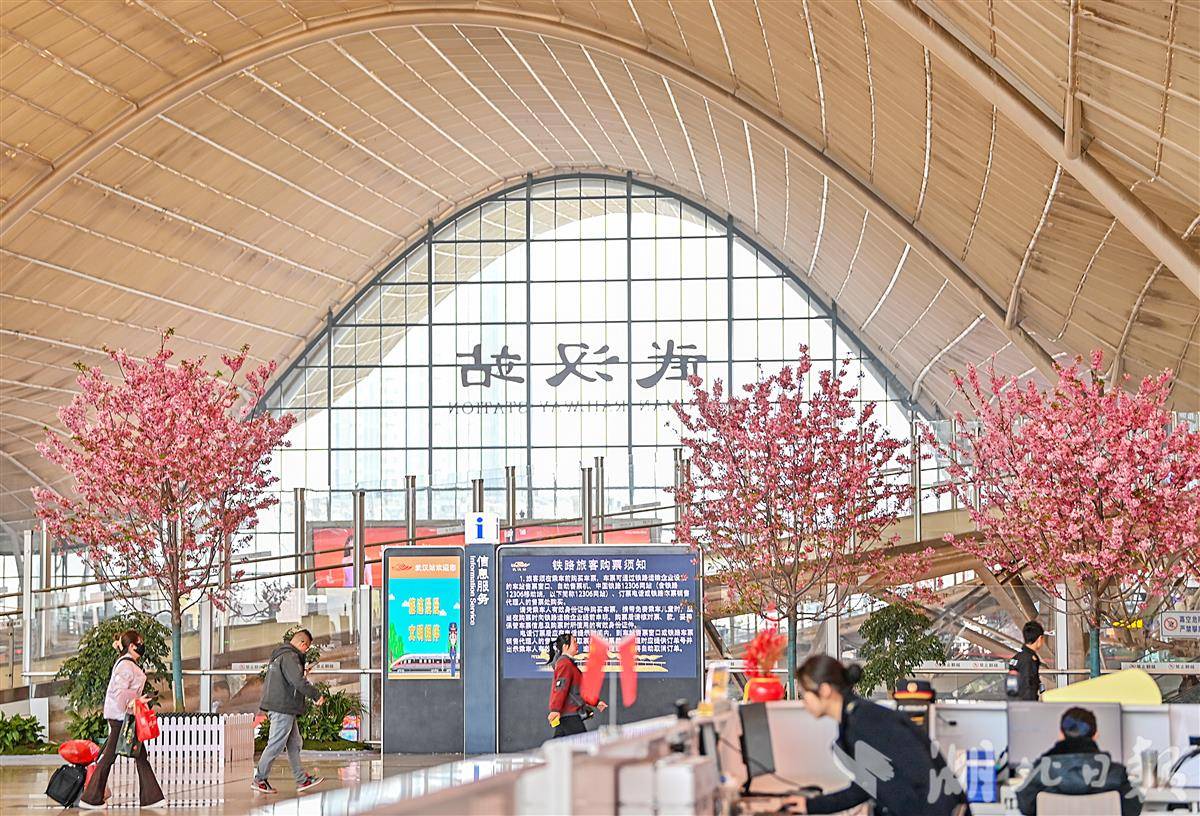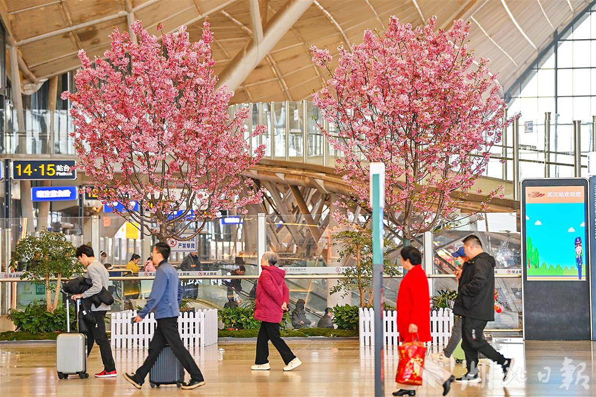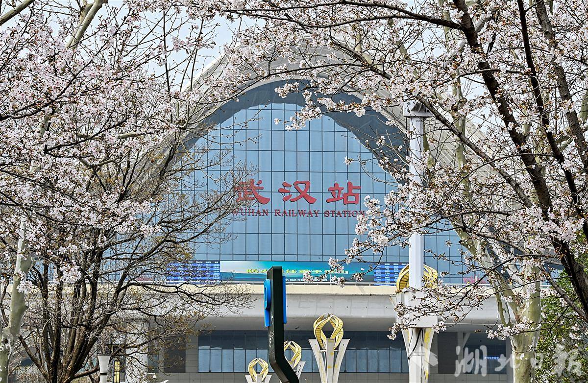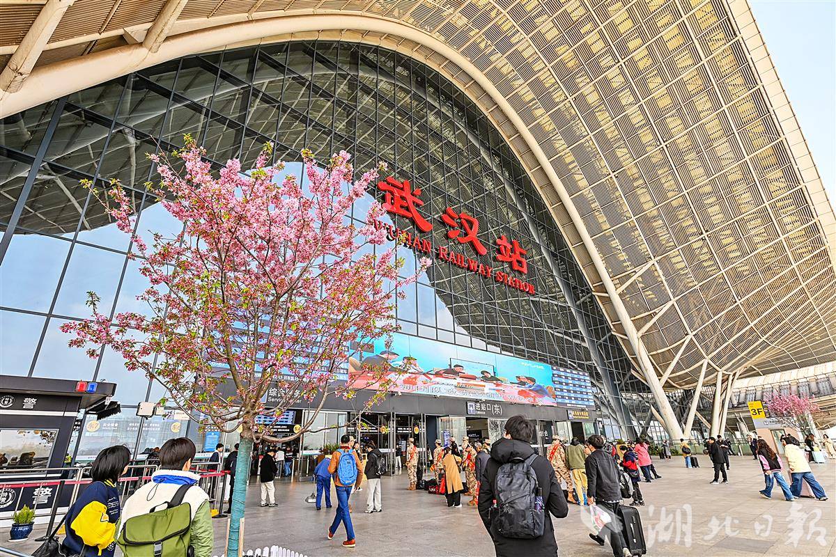 3月21日,武铁武汉站东、西大门前和进站口站厅内,数株盛开的真樱花吸引了众多旅客驻足观赏。