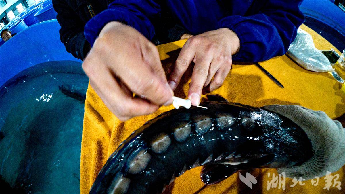 为中华鲟量身定制的“电子身份证”大小与一粒大米相近,植入过程对鱼体几乎无伤害,可长期有效存储鱼体相关信息,为后续追踪中华鲟洄游规律、监测生存状况、评估放流效果提供关键数据支撑,实现每一条放流中华鲟的精准守护与全程可溯。(湖北日报全媒记者 刘曙松 摄)