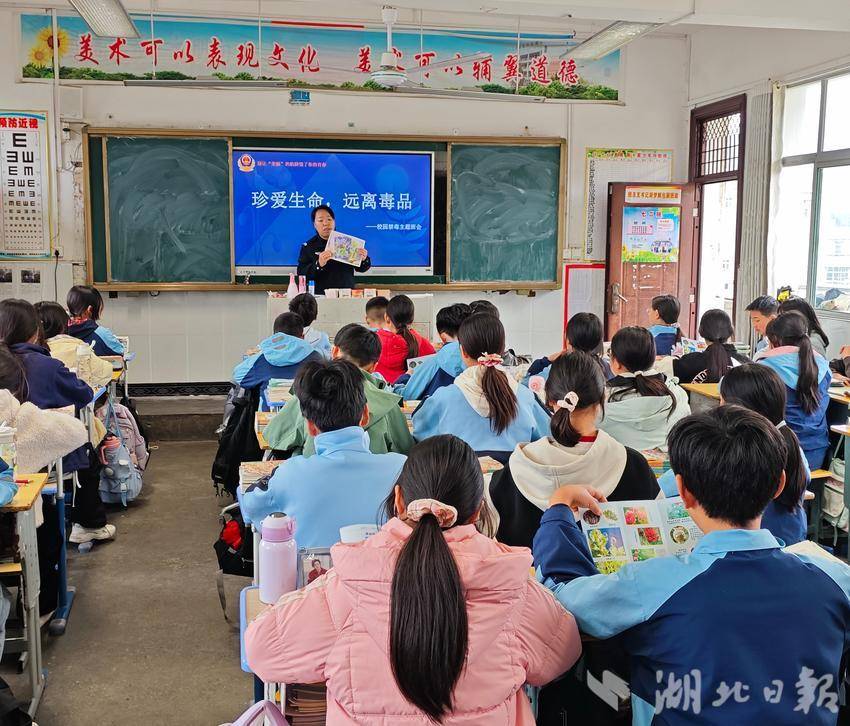 课间活动时间,校园走廊化身为“禁毒微课堂”。宣传人员通过发放图文并茂的禁毒手册、展示毒品图片,向同学们讲解新型毒品的伪装性与危害性。派出所民警结合真实案例,以案释法,提醒学生警惕“奶茶”“跳跳糖”等伪装毒品,现场互动气氛热烈。