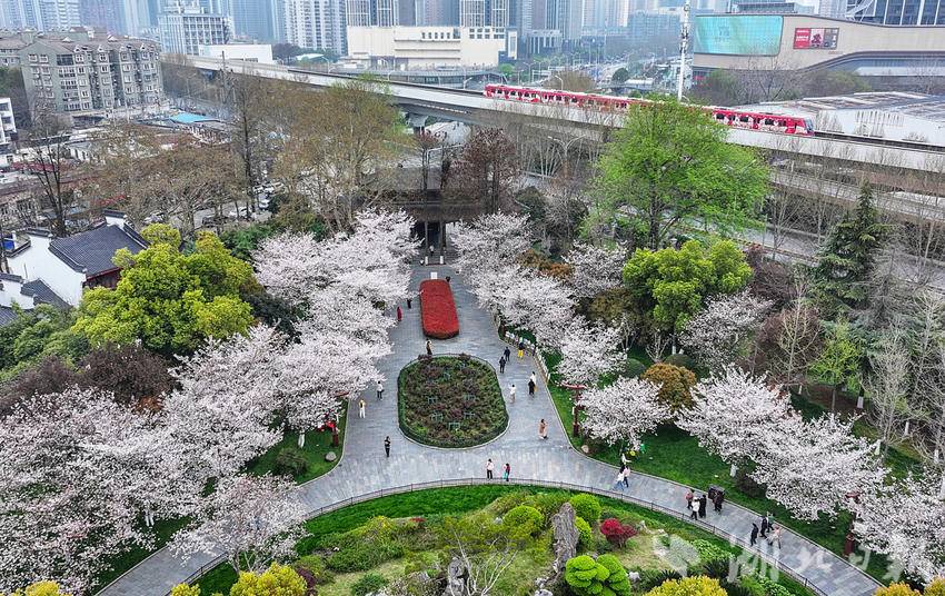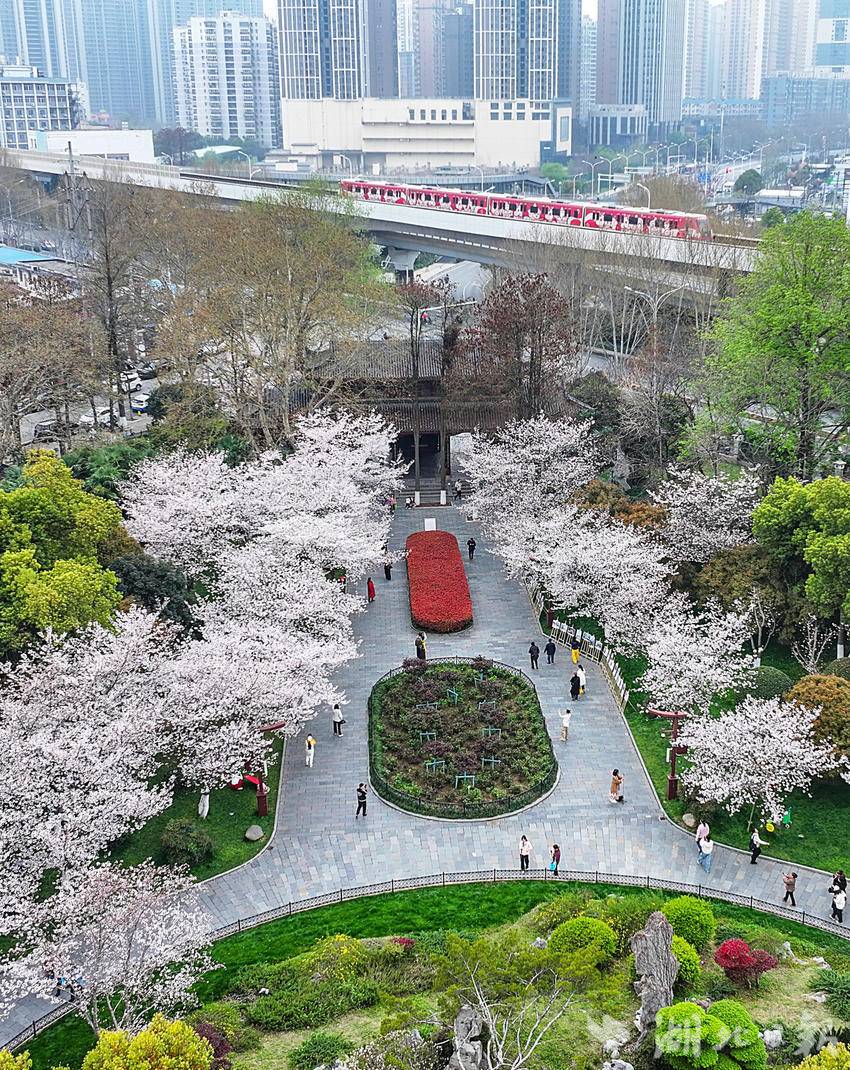 3月24日,武汉地铁1号线列车从城市上空飞驰而过,许多市民乘坐地铁1号线来堤角公园欣赏樱花。堤角公园上千株樱花盛放,在这里可以拍摄到樱花与轨道交通一号线同框的照片。(湖北日报全媒记者 朱熙勇 摄)
