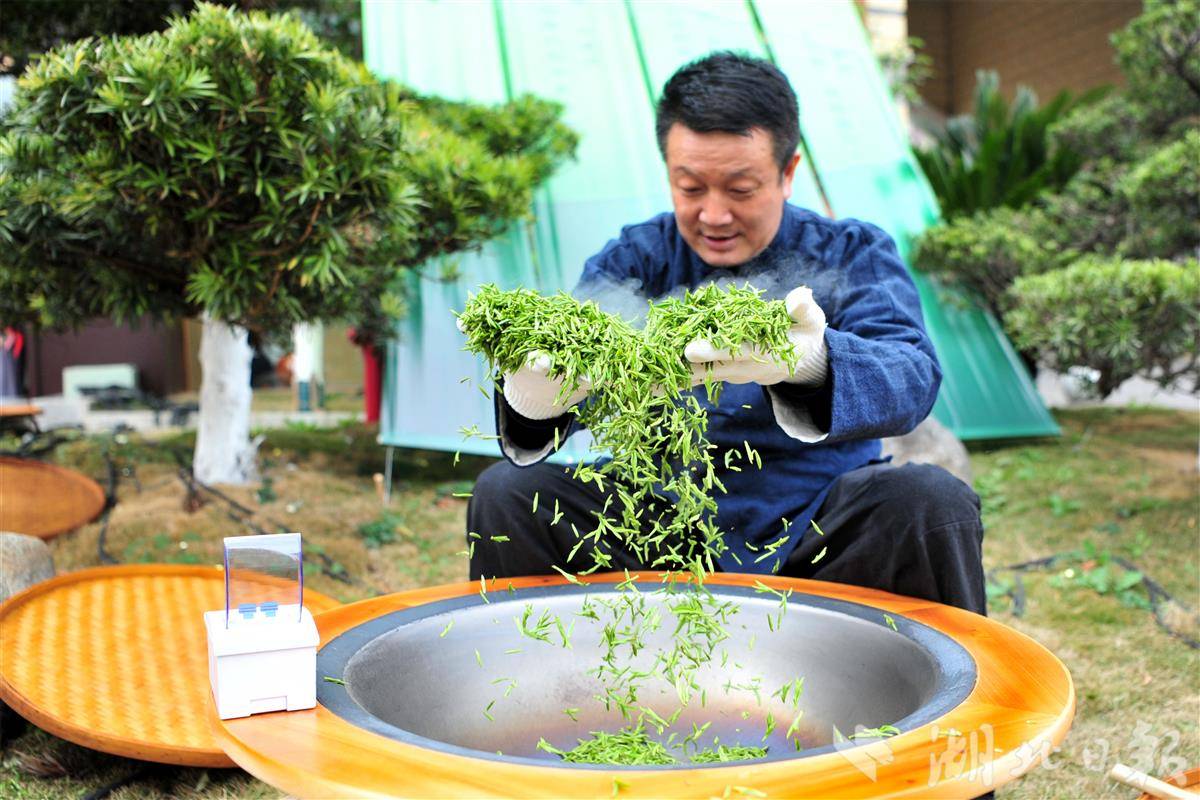 宜昌市夷陵区以“峡江春早・宜路领鲜”为主题的2026春茶季·炒制第一锅春茶活动在萧品记萧品茶铺启幕,当地制茶师傅现场以娴熟稳健的手法,完成翻抖、揉捻等核心工序,展示三峡流域传承百年的传统手工制茶技艺,吸引不少市民围观,感知第一锅春茶的“鲜”味从何而来。(视界网 张国荣 摄)