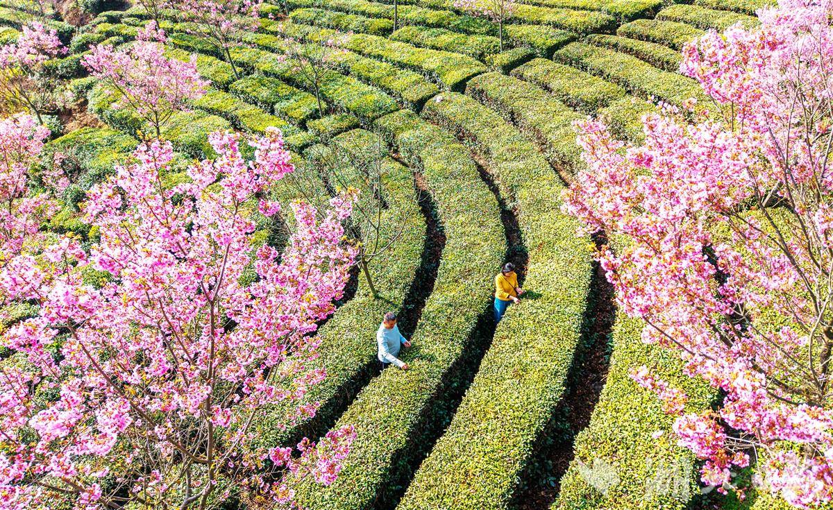 黄冈市英山县河东樱花园内,层层叠叠的茶园与盛放的早樱相映成趣,游客穿行其间体验采茶,感受春日里茶乡的独特韵味。(视界网 王江 摄)