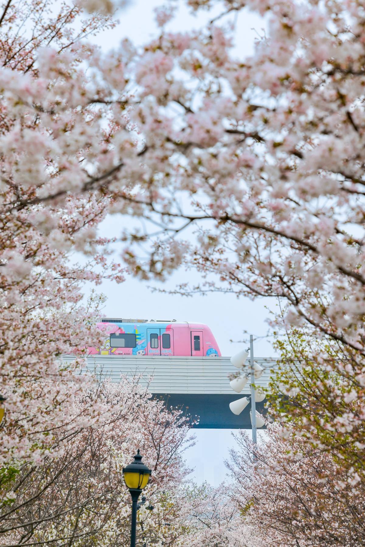 今年春天,武汉的簇簇粉樱与摩天楼宇、空轨碰撞,惊艳亮相。
