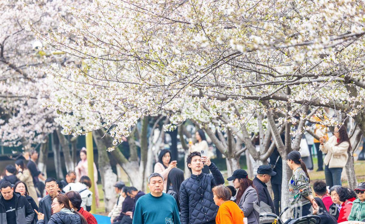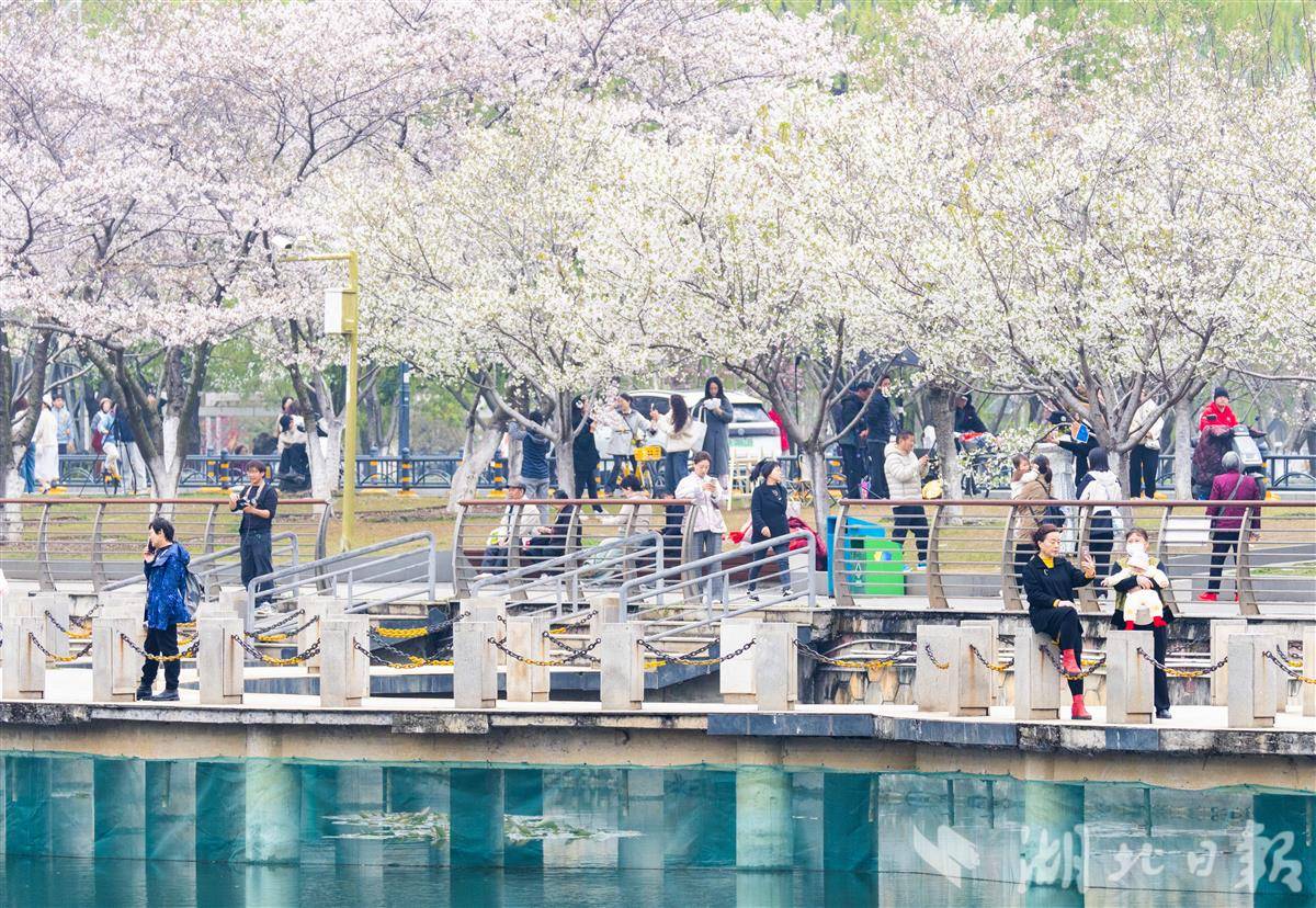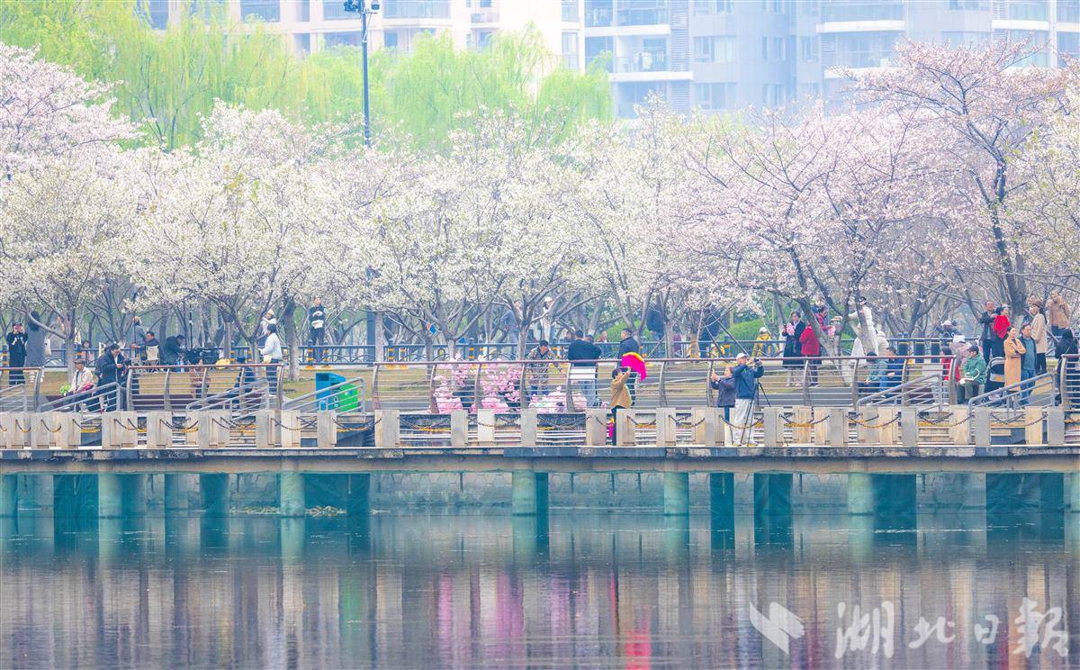 3月24日,武汉西北湖公园樱花进入盛花期,如云似霞,吸引众多游客拍照打卡。