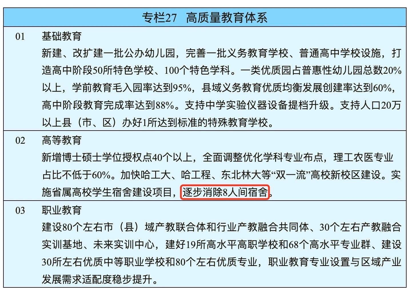 3月21日,黑龙江省人民政府印发《黑龙江省国民经济和社会发展第十五个五年规划纲要》。其中提到:“实施省属高校学生宿舍建设项目,逐步消除8人间宿舍。”