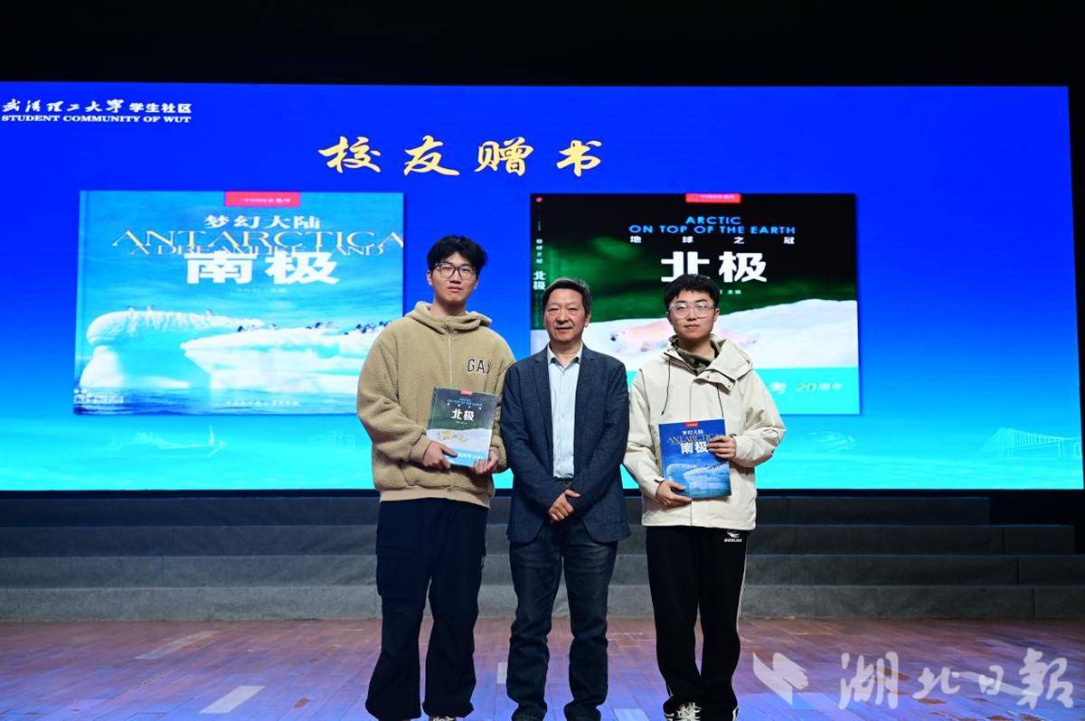 活动现场,吴军向学生代表赠送《南极》《北极》著作,传递极地探索的初心与力量。学生代表为吴军、莫鉴辉两位校友献上鲜花,致以诚挚敬意。