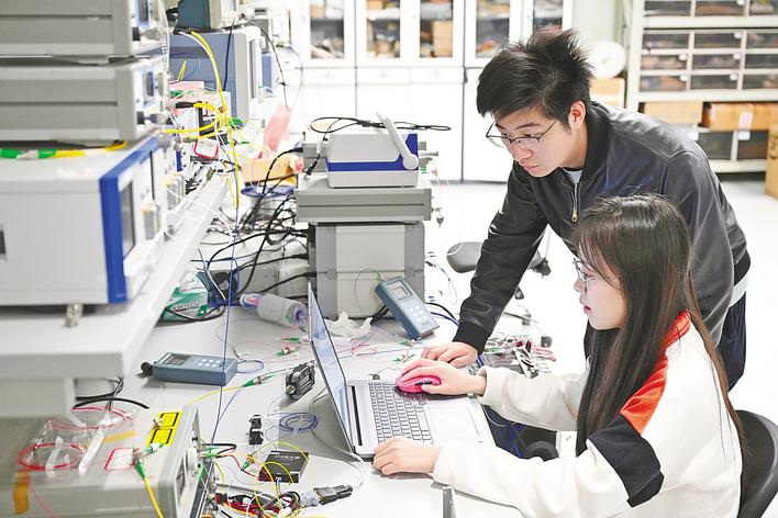 3月24日,中国信科集团光通信技术和网络全国重点实验室工作人员,对传输系统实验平台进行调试。 (湖北日报通讯员 张璨龙 摄)