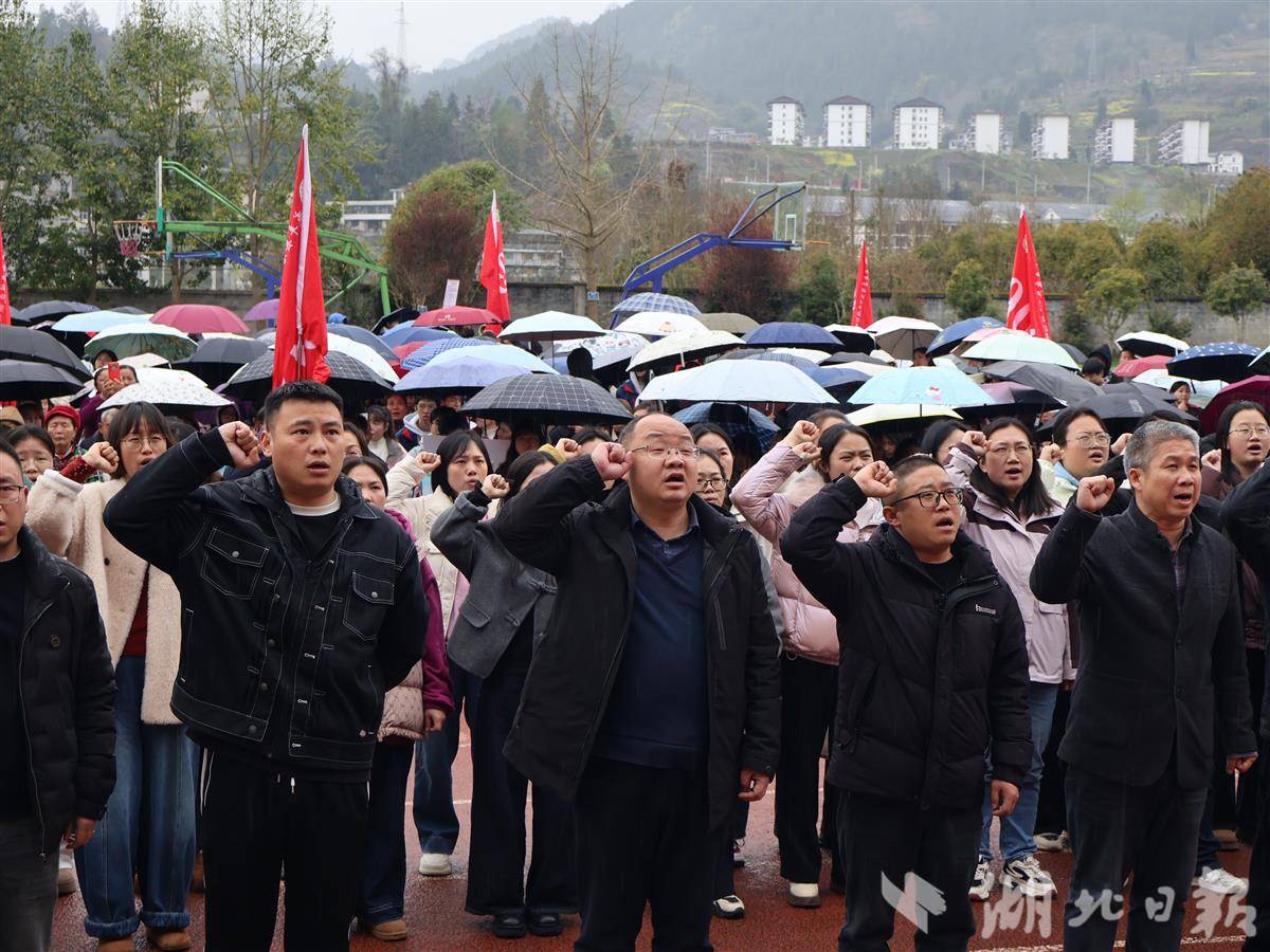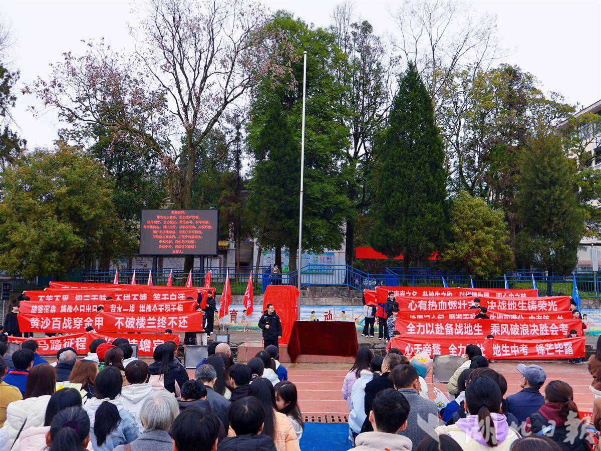 湖北日报讯(通讯员杨洞、李娅群)3月25日,唐崖镇民族初级中学操场庄重热烈,中考暨会考八十天誓师大会隆重举行,全校师生及八、九年级家长齐聚现场,同心共迎冲刺时刻。
