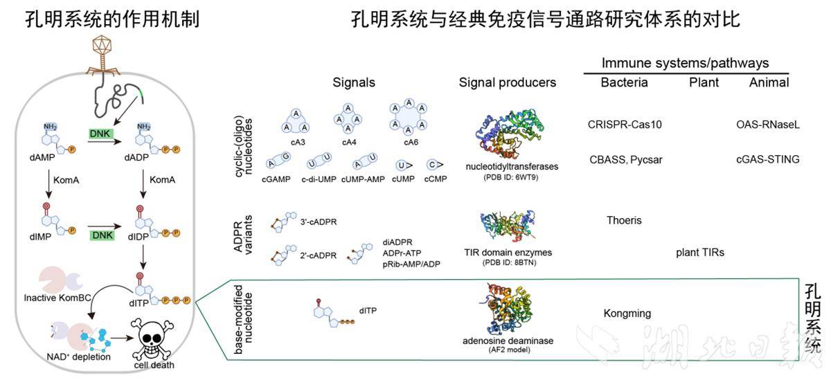 华中农业大学韩文元教授团队系统发掘细菌抗噬菌体免疫途径,发现了一类通过碱基修饰合成脱氧肌苷三磷酸(dITP)信号分子的细菌免疫系统。该系统“借用”噬菌体的脱氧核苷酸激酶(DNK)催化dITP合成的关键步骤,因而以草船借箭的典故,将其命名为孔明系统。dITP激活孔明系统效应复合体的NAD+降解活性,导致NAD+耗竭与代谢崩溃,从而诱导细胞死亡并抑制噬菌体增殖。同时,噬菌体能够通过降解dITP的前体dAMP抑制孔明系统,实现免疫逃逸。该成果突破了核苷酸类信号分子的经典研究体系,揭示了细菌与噬菌体在核苷酸代谢维度展开的新型分子博弈,为噬菌体的应用和分子检测工具的开发提供了新机遇。