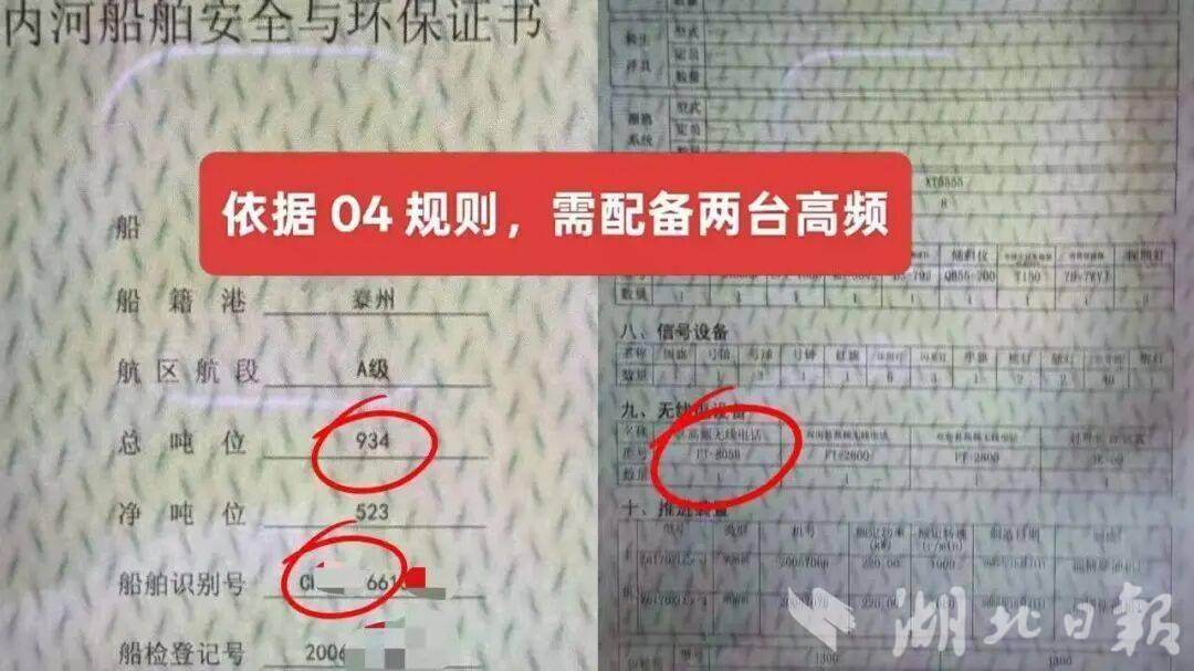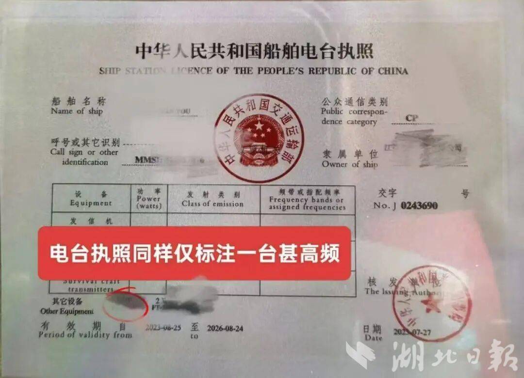 在后续核对船舶检验证书与电台执照时,执法人员发现了更为关键的船检质量问题:该船为2005年安装龙骨,且船舶总吨为934吨,根据《内河船舶法定检验技术规则(2004)》规定,此类船舶应配备两台甚高频设备。然而,该船船舶检验证书与电台执照上均仅标注一台“FT-805B”甚高频设备,存在明显的“证船不符”及检验发证漏项问题。
