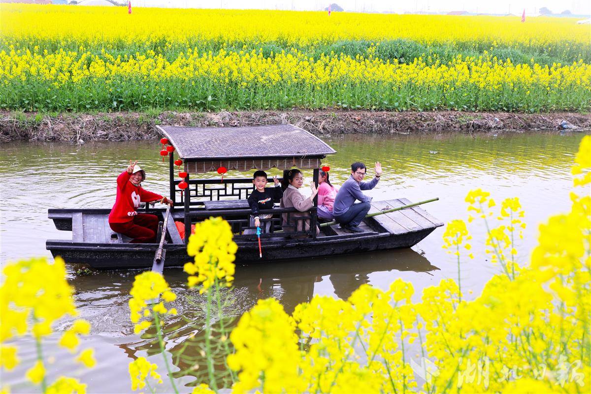 游客徜徉花海中,或拍照打卡,或悠闲漫步,或乘船游览,沉浸式感受春日的生机与美好。