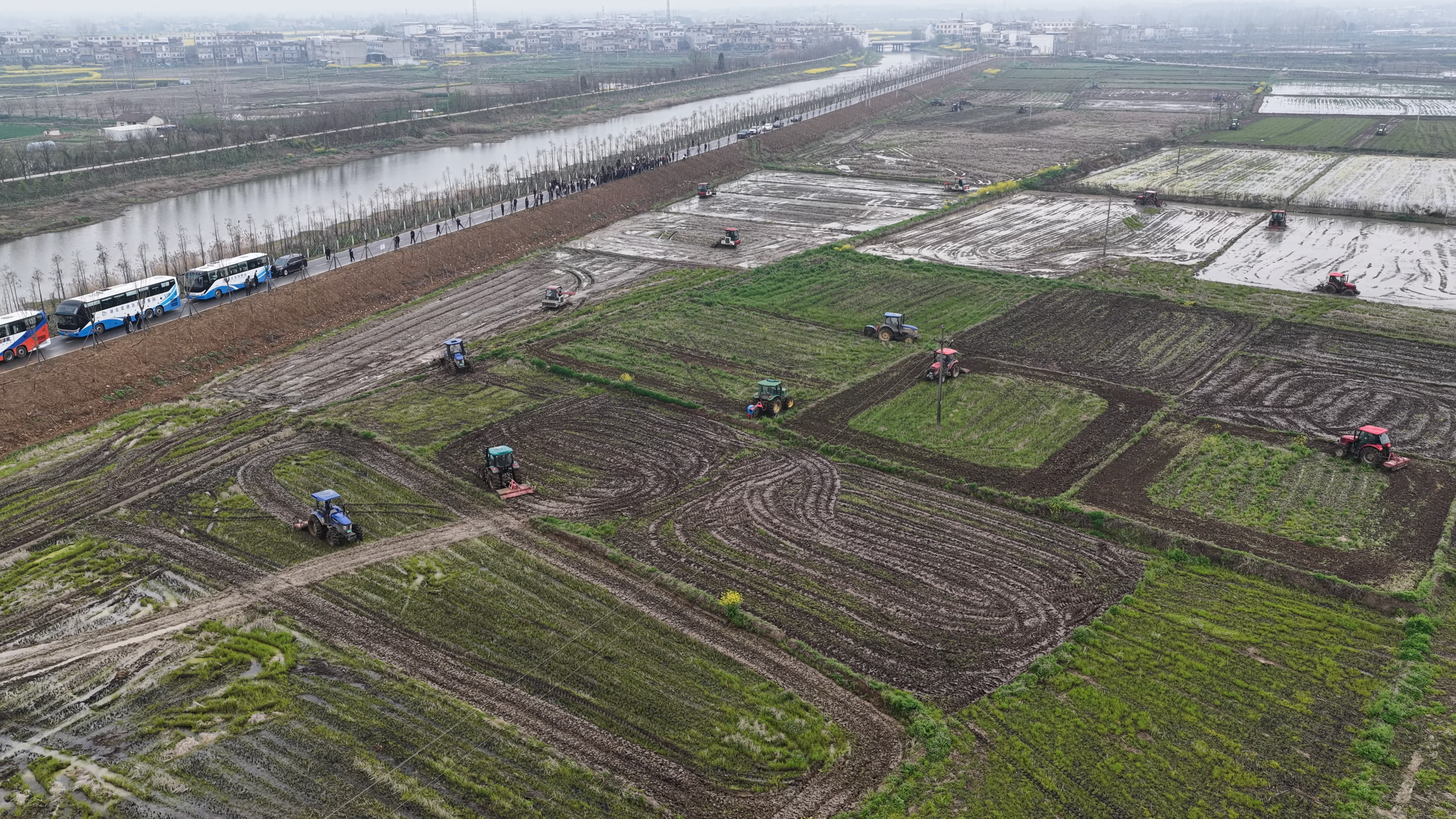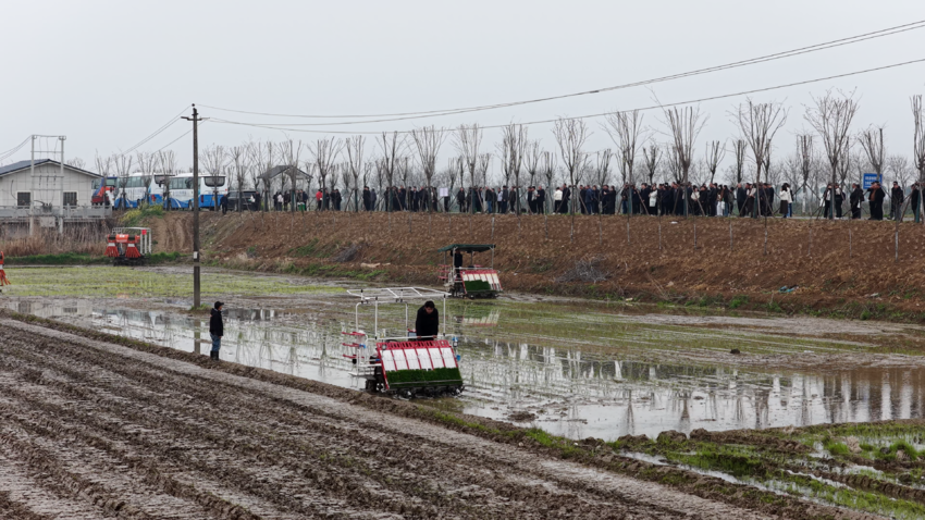 天门市惠丰水稻种植合作社的春耕作业现场,50台大功率拖拉机分散在田间地头,同步开展铧式犁、翻转犁、驱动圆盘犁、旋耕机、机耕船、水田激光平地机、开沟机、筑埂机等耕整地机具作业演示,电动智能拖拉机、无人驾驶插秧机、抛秧机等新装备穿梭往来,生动展示了我省农机化发展的新成果、新水平。