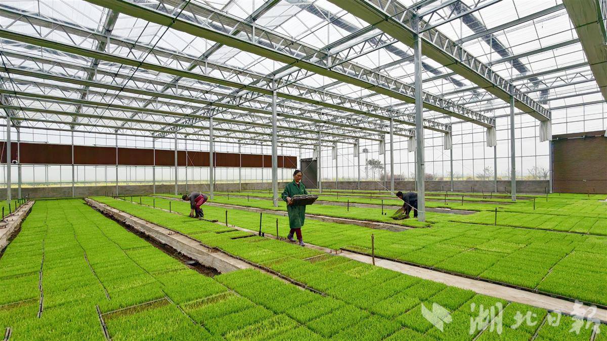 智能育秧工厂内,工作人员将秧苗整齐摆放。