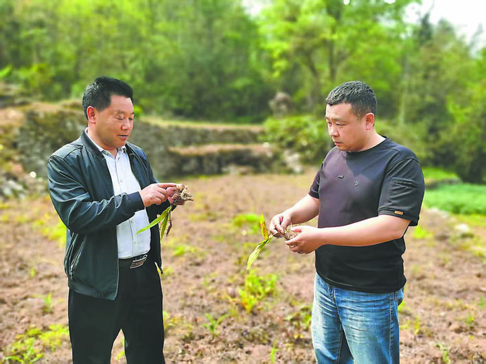 陈刚(右)了解村里农作物种植情况。(资料照片)