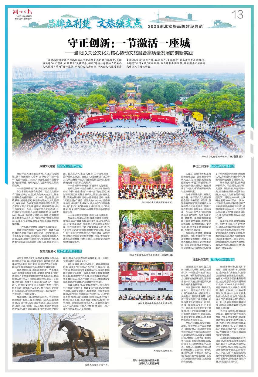3月26日,湖北日报推出《品牌立荆楚 文旅强支点——2025湖北文旅品牌建设典范》特刊,通过全面宣传一批“品牌建设有战略、落地运营有实效、产业带动有价值、示范引领有标杆意义”的优秀文旅主体,展示湖北建设世界知名文化旅游目的地打造的品牌雁阵,让更多湖北文旅品牌走出湖北、走向世界,为湖北文旅产业高质量发展和“品牌强省”建设作出更大贡献!