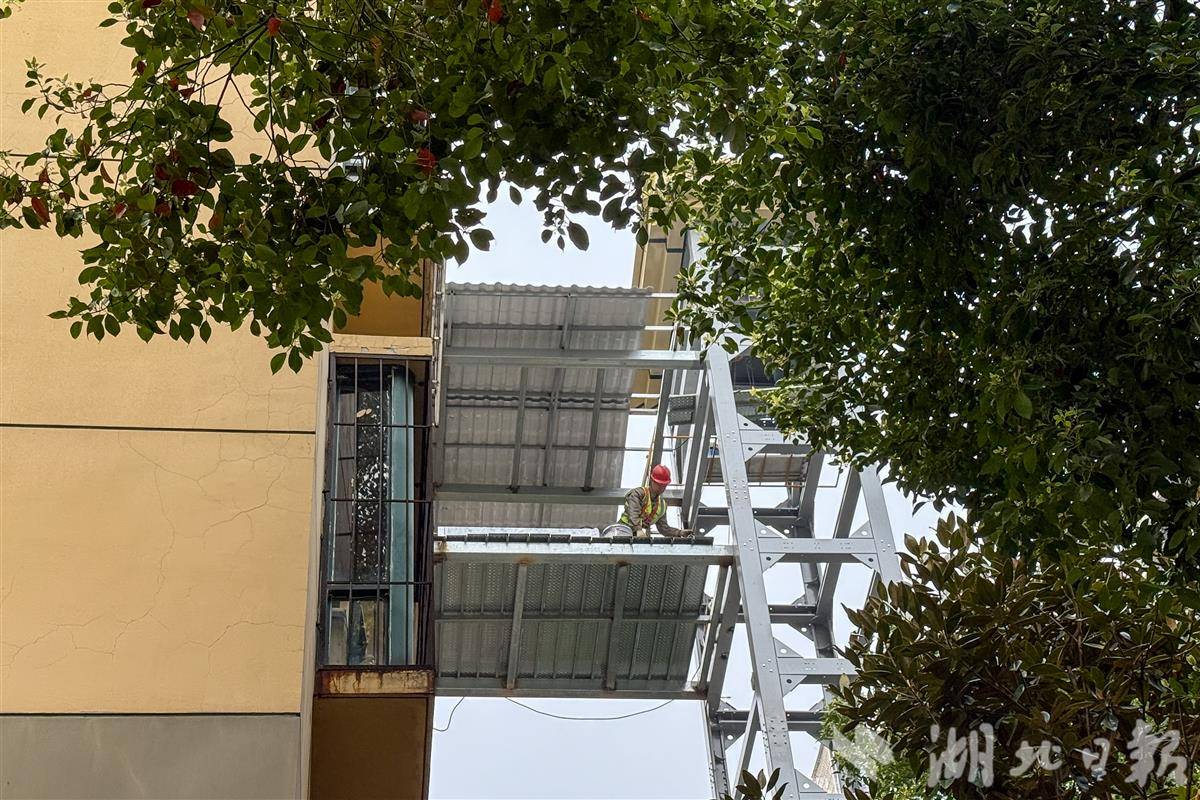 2026年3月25日,武汉市东西湖区吴家山街额头湾社区富丽雅小区内,施工人员正忙着进行单元楼电梯加装作业,钢结构框架已初具雏形。这是该小区2026年推进的第2部电梯加装工程,预计5月初即可投入使用。