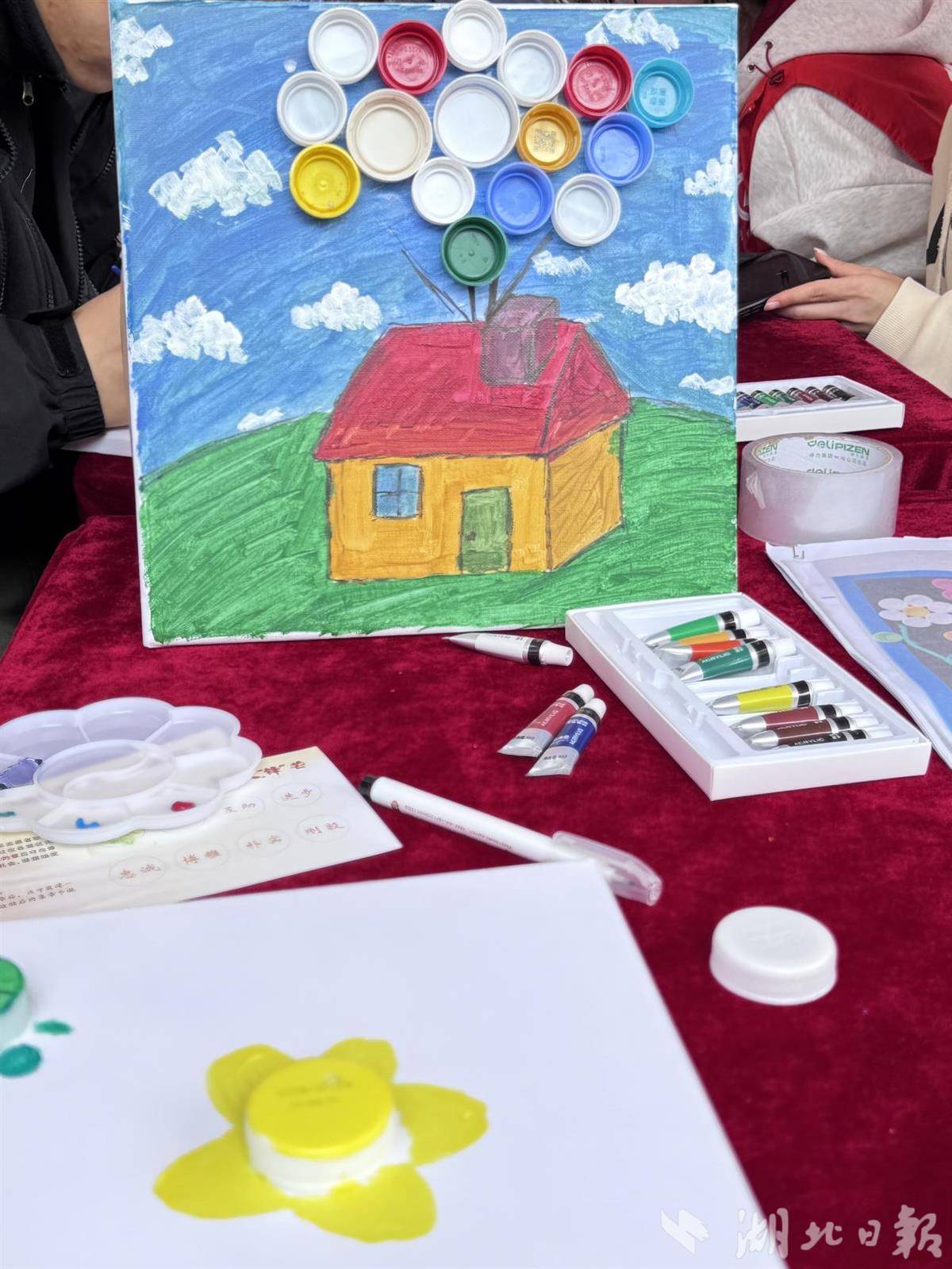 在活动现场,武汉商贸职业学院微尘爱心服务队打造的瓶盖拼贴画创意工坊格外引人注目。志愿者们提前募集并精心分类300余个废旧瓶盖,在现场耐心陪伴参与者发挥巧思,将不起眼的瓶盖转化为充满生机的环保作品。此外,队员们还主动支援植物拓染区,细致做好物料准备与残渣堆肥处理。