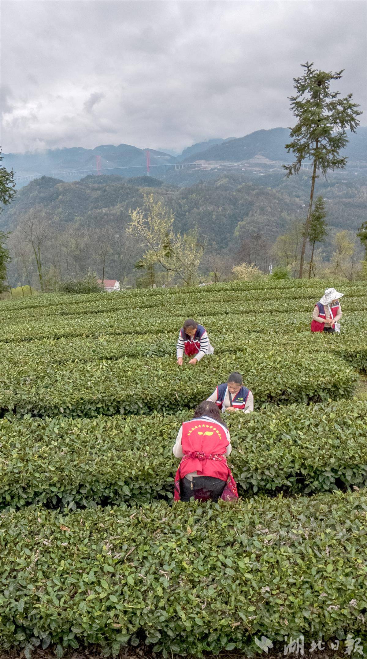 茶农们穿梭在层层叠叠的茶垄间,摘下今春第一抹新绿。(湖北日报全媒记者 刘曙松 摄)